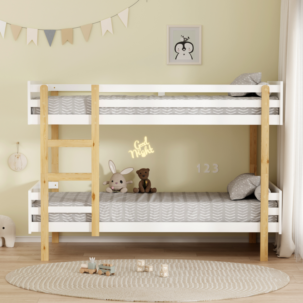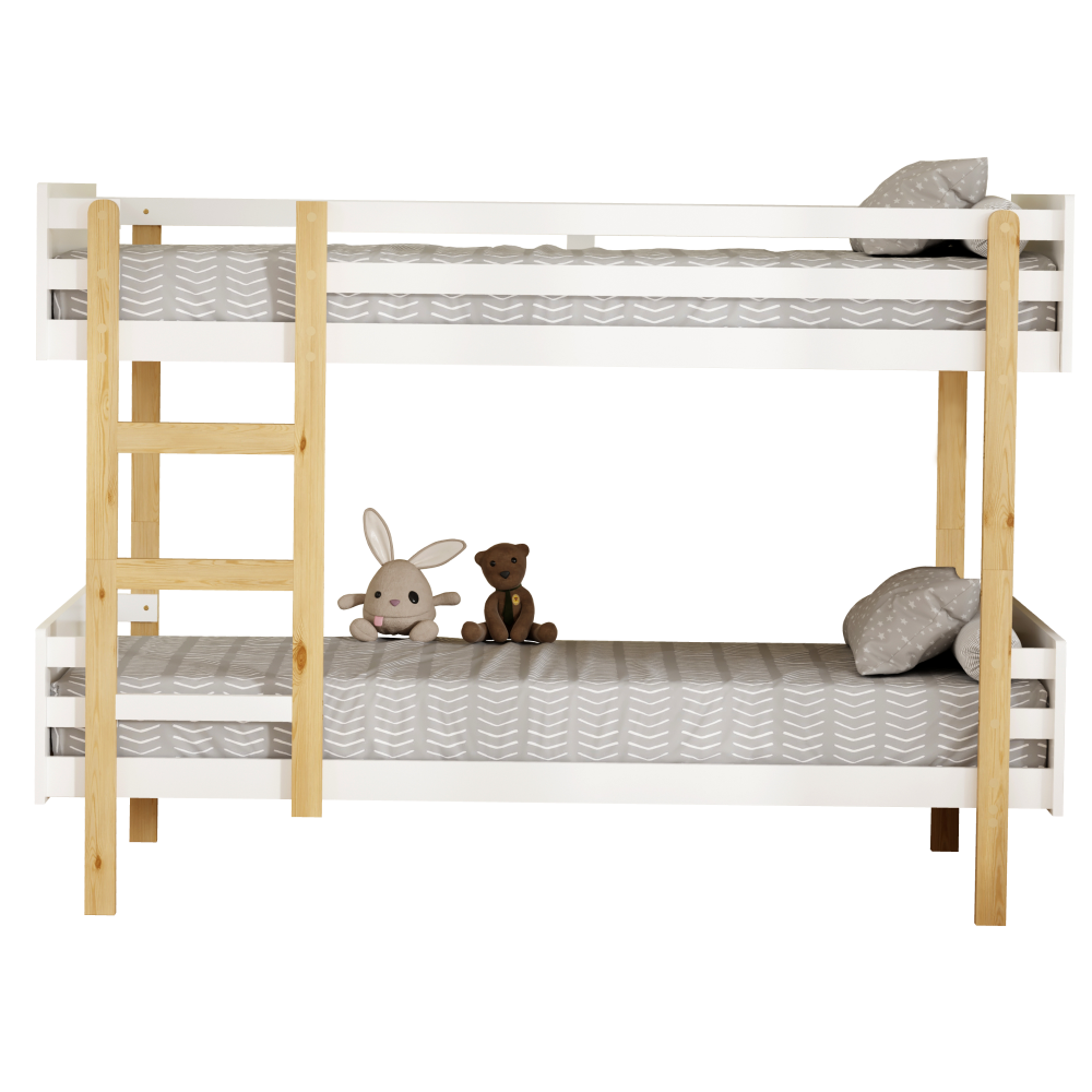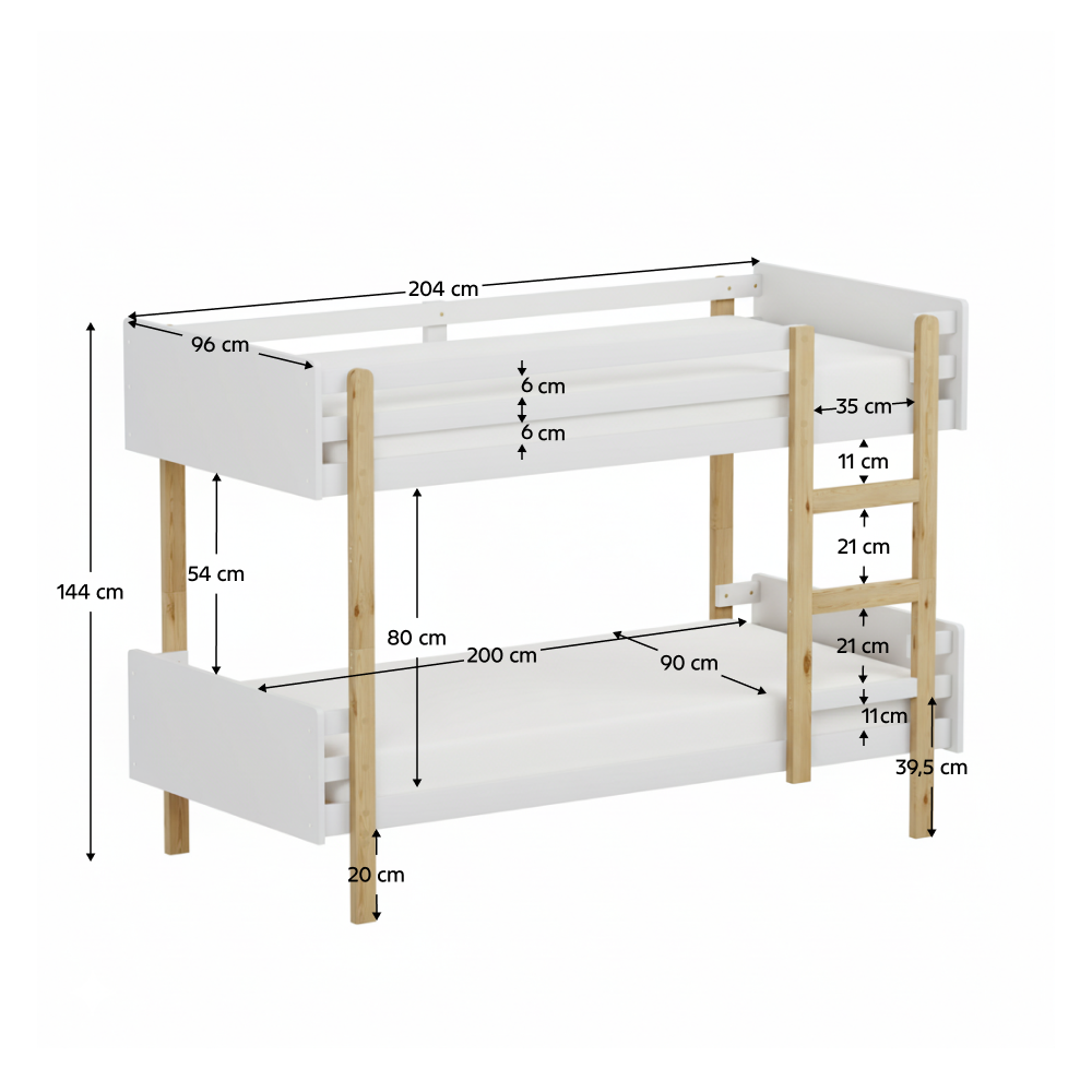 Materiál: borové dřevo/překližka Barva: bílá/dub Rozměry (ŠxHxV): 96x204x144cm Plocha na spaní (ŠxD): 90x200 cm Výška mezi spodním a horním lůžkem: 80 cm Nosnost na lůžko: 90 kg Na nožičkách S bezpečnostní bariérou Dodáváno s žebříkem Možnost namontovat zábranu a žebřík na levou nebo pravou stranu Dodávána bez matrace Možnost zakoupit matraci z naší nabídky Doporučená minimální výška matrace: 7 cm Zapuštění matrace: 3 cm Dodávána s překližkovými rošty Použité barvy a laky splňují všechny stanovené normy a nezávadnosti Dodáváno v demontu Doporučení pro údržbu: - ošetřujte vlhčeným hadříkem - používejte pouze mýdlo PH neutrální - nevystavujte přímému slunečnímu záření