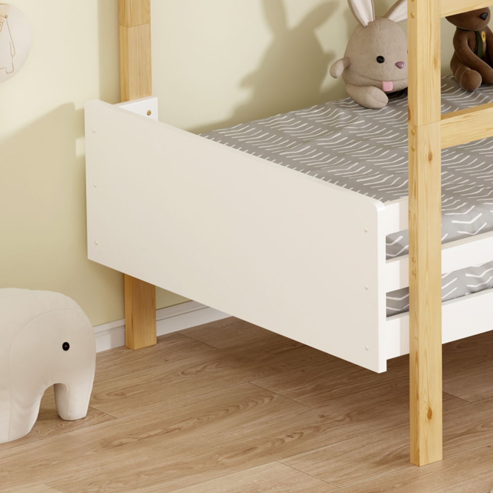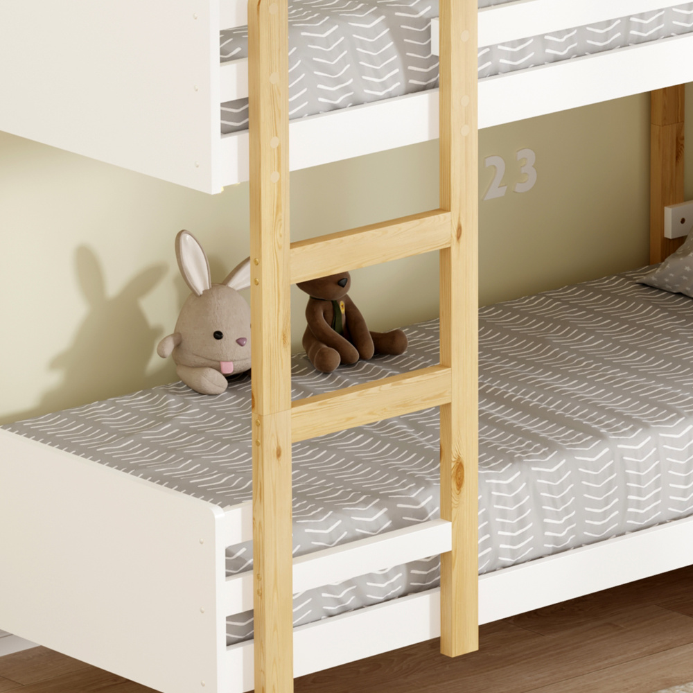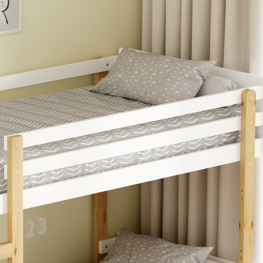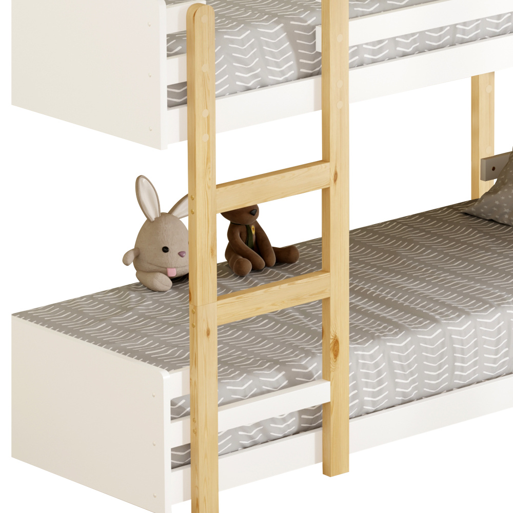 Materiál: borové dřevo/překližka Barva: bílá/dub Rozměry (ŠxHxV): 96x204x144cm Plocha na spaní (ŠxD): 90x200 cm Výška mezi spodním a horním lůžkem: 80 cm Nosnost na lůžko: 90 kg Na nožičkách S bezpečnostní bariérou Dodáváno s žebříkem Možnost namontovat zábranu a žebřík na levou nebo pravou stranu Dodávána bez matrace Možnost zakoupit matraci z naší nabídky Doporučená minimální výška matrace: 7 cm Zapuštění matrace: 3 cm Dodávána s překližkovými rošty Použité barvy a laky splňují všechny stanovené normy a nezávadnosti Dodáváno v demontu Doporučení pro údržbu: - ošetřujte vlhčeným hadříkem - používejte pouze mýdlo PH neutrální - nevystavujte přímému slunečnímu záření
