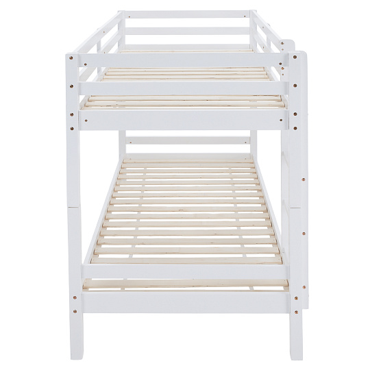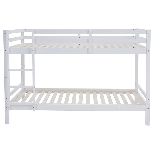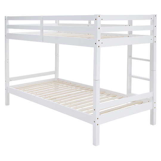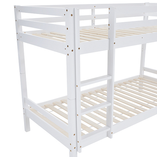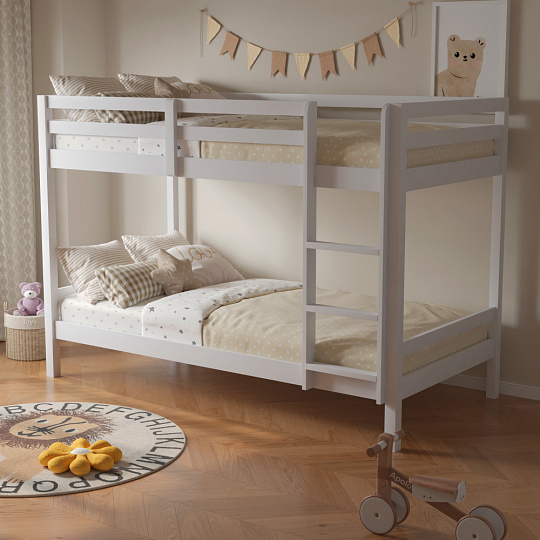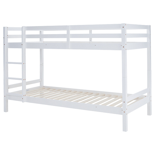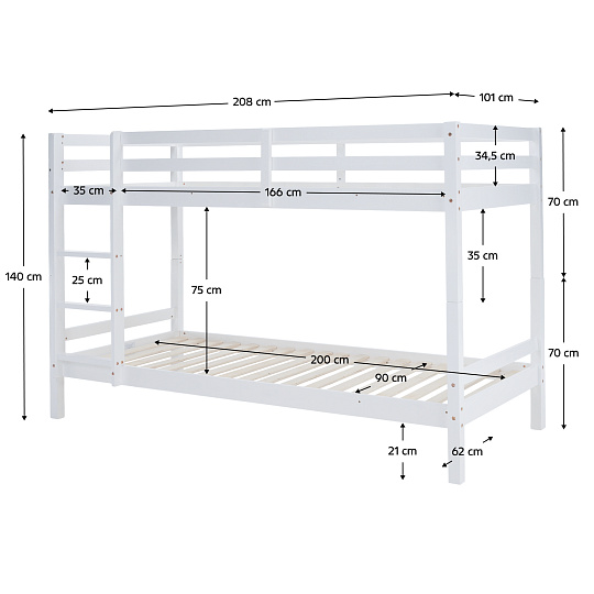 Materiál: borové dřevo Barva: bílá Rozměry (ŠxHxV): 208x101x140 cm Plocha na spaní (ŠxH): 90x200 cm Výška mezi spodním a horním lůžkem: 75 cm Tloušťka materiálu: 2 cm Nosnost na horní lůžko: 90 kg Nosnost na dolní lůžko: 95 kg Doporučená výška matrace na spodní lůžko: 20 cm Doporučená výška matrace na horní lůžko: 14 cm Na nožičkách Výška nožiček spodní lůžko: 21 cm Výška nožiček horní lůžko: 35 cm Tloušťka materiálu nohy: 5x5 cm Hrany postele jsou zaoblené Dodáváno s žebříkem Možnost upevnit žebřík na pravé nebo levé straně Horní postel se zábranou proti pádu Rozložitelná na dvě lůžka Dodáváno s rolovaným roštem Dodáváno bez matrace Možnost zakoupit pružinové matrace z naší nabídky Použité barvy a laky splňují všechny stanovené normy a nezávadnosti Dodáváno v demontu