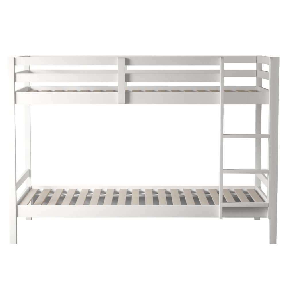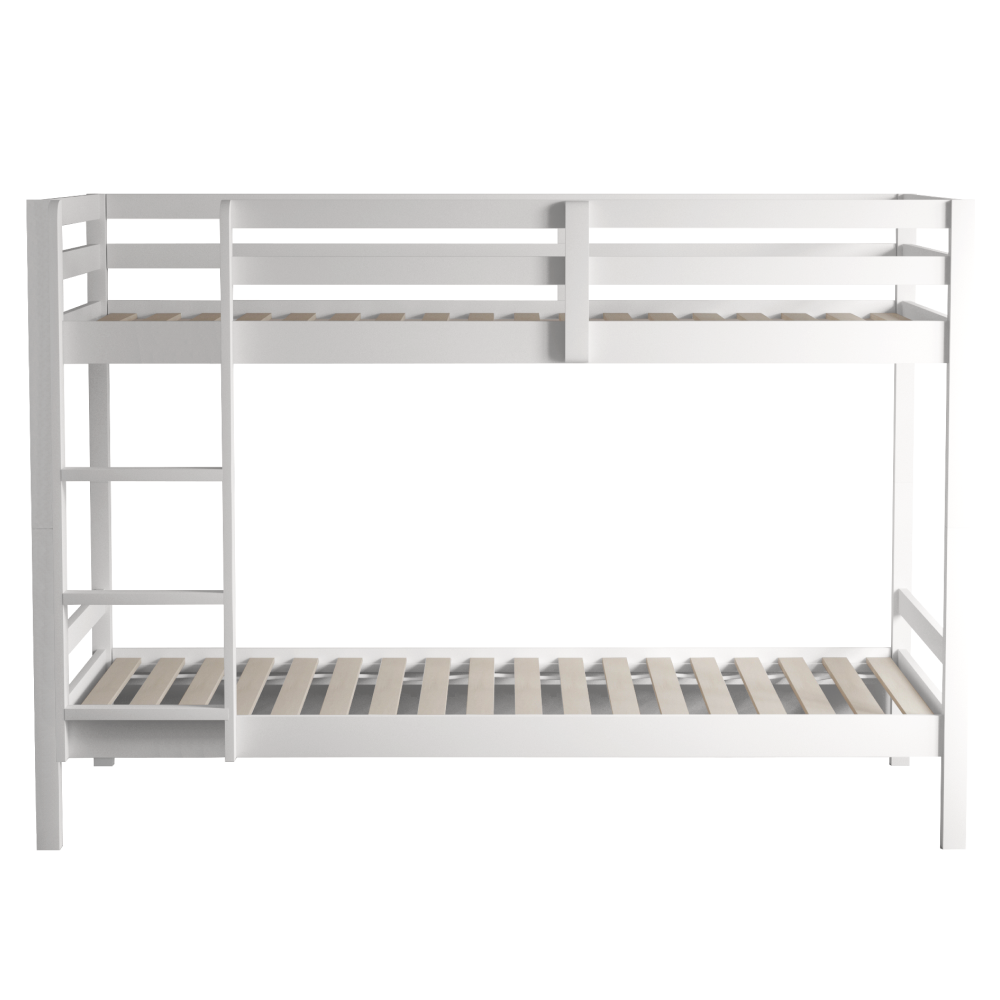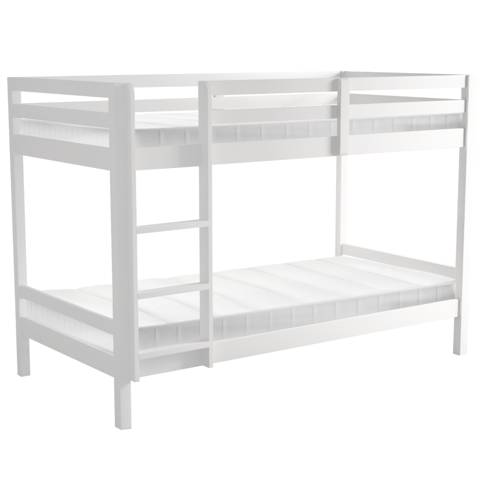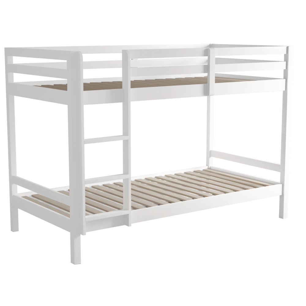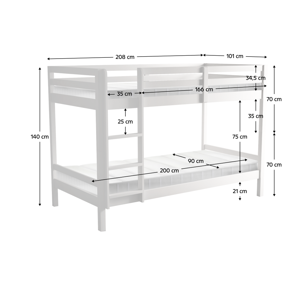Materiál: borové dřevo Barva: bílá Rozměry (ŠxHxV): 208x101x140 cm Plocha na spaní (ŠxH): 90x200 cm Výška mezi spodním a horním lůžkem: 75 cm Tloušťka materiálu: 2 cm Nosnost na horní lůžko: 90 kg Nosnost na dolní lůžko: 95 kg Doporučená výška matrace na spodní lůžko: 20 cm Doporučená výška matrace na horní lůžko: 14 cm Na nožičkách Výška nožiček spodní lůžko: 21 cm Výška nožiček horní lůžko: 35 cm Tloušťka materiálu nohy: 5x5 cm Hrany postele jsou zaoblené Dodáváno s žebříkem Možnost upevnit žebřík na pravé nebo levé straně Horní postel se zábranou proti pádu Rozložitelná na dvě lůžka Dodáváno s rolovaným roštem Dodáváno bez matrace Možnost zakoupit pružinové matrace z naší nabídky Použité barvy a laky splňují všechny stanovené normy a nezávadnosti Dodáváno v demontu