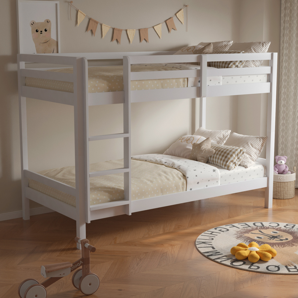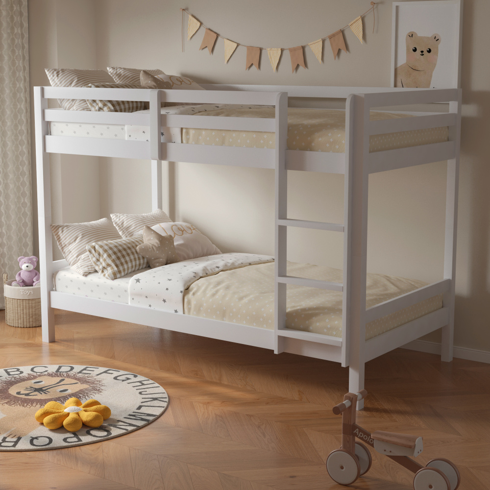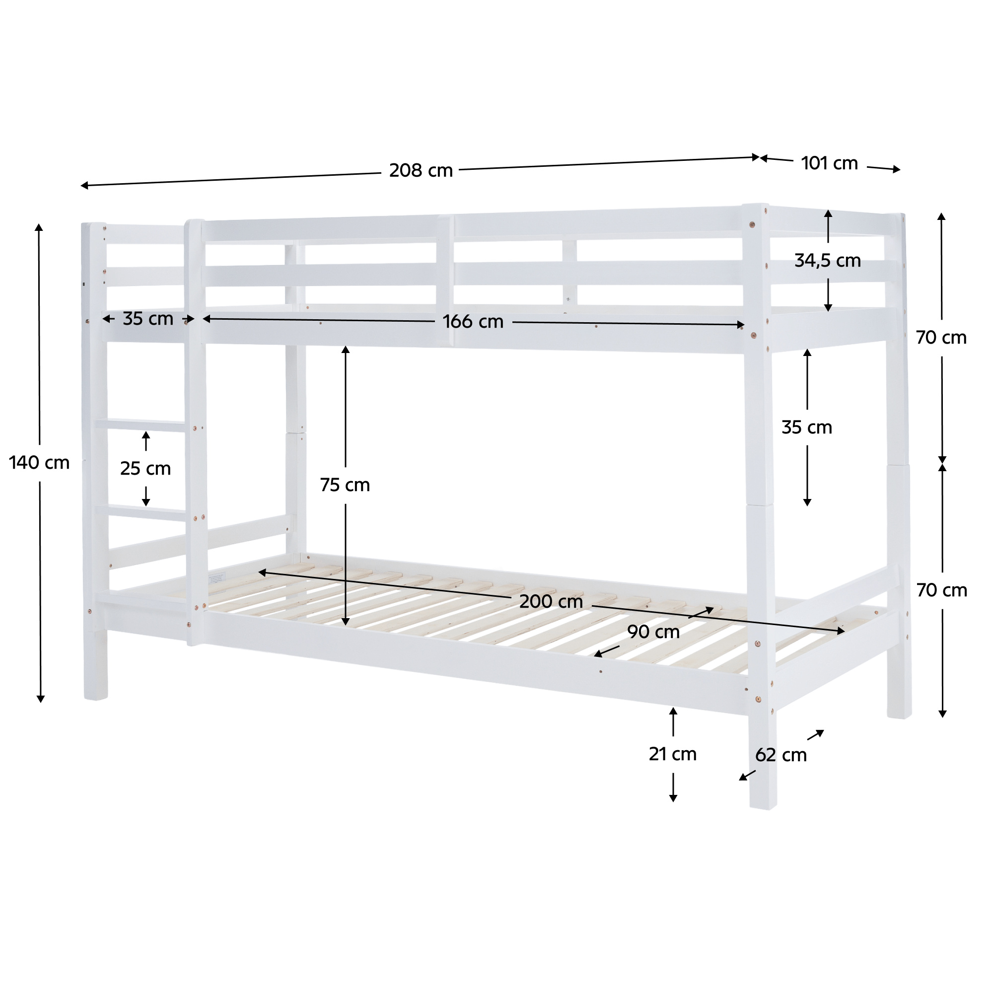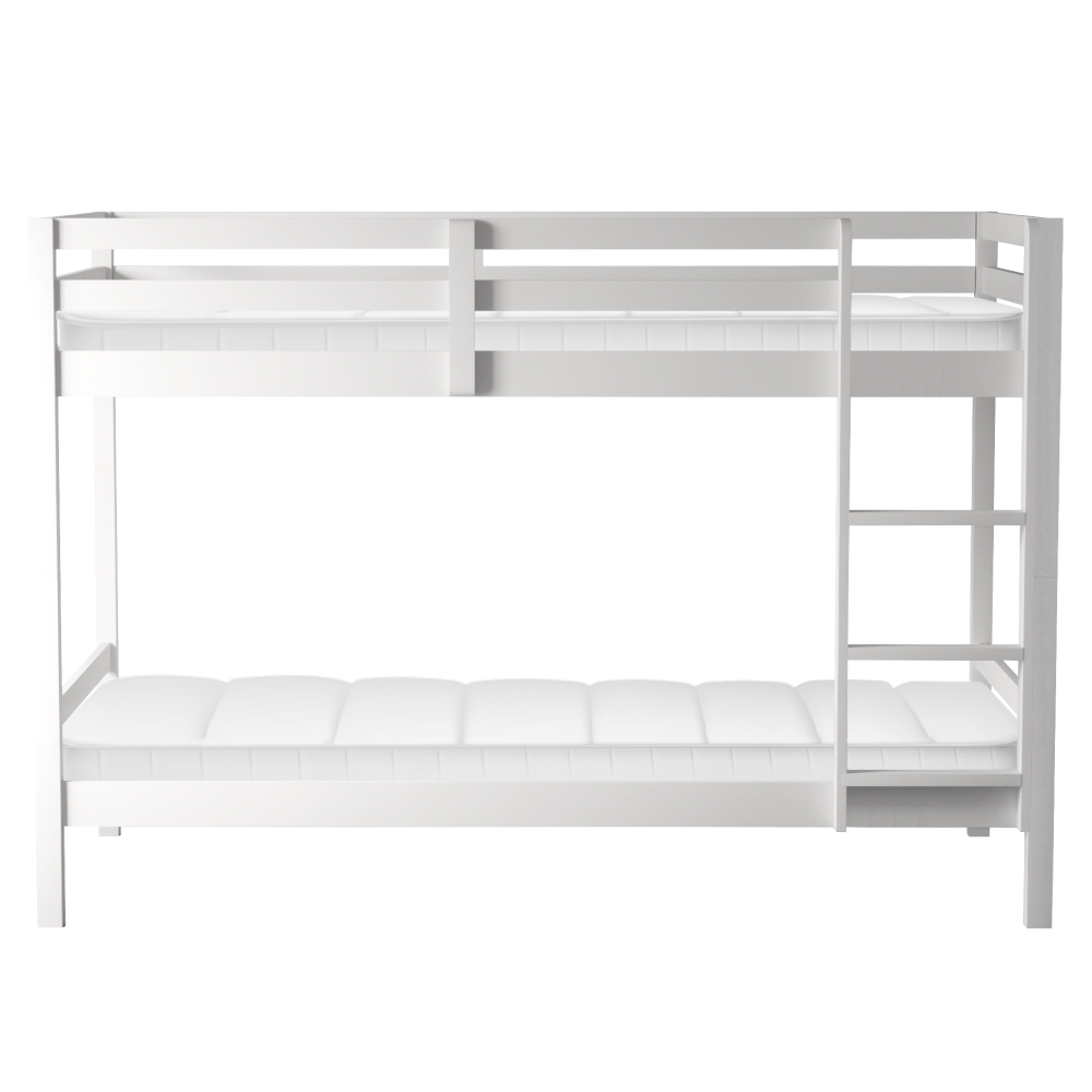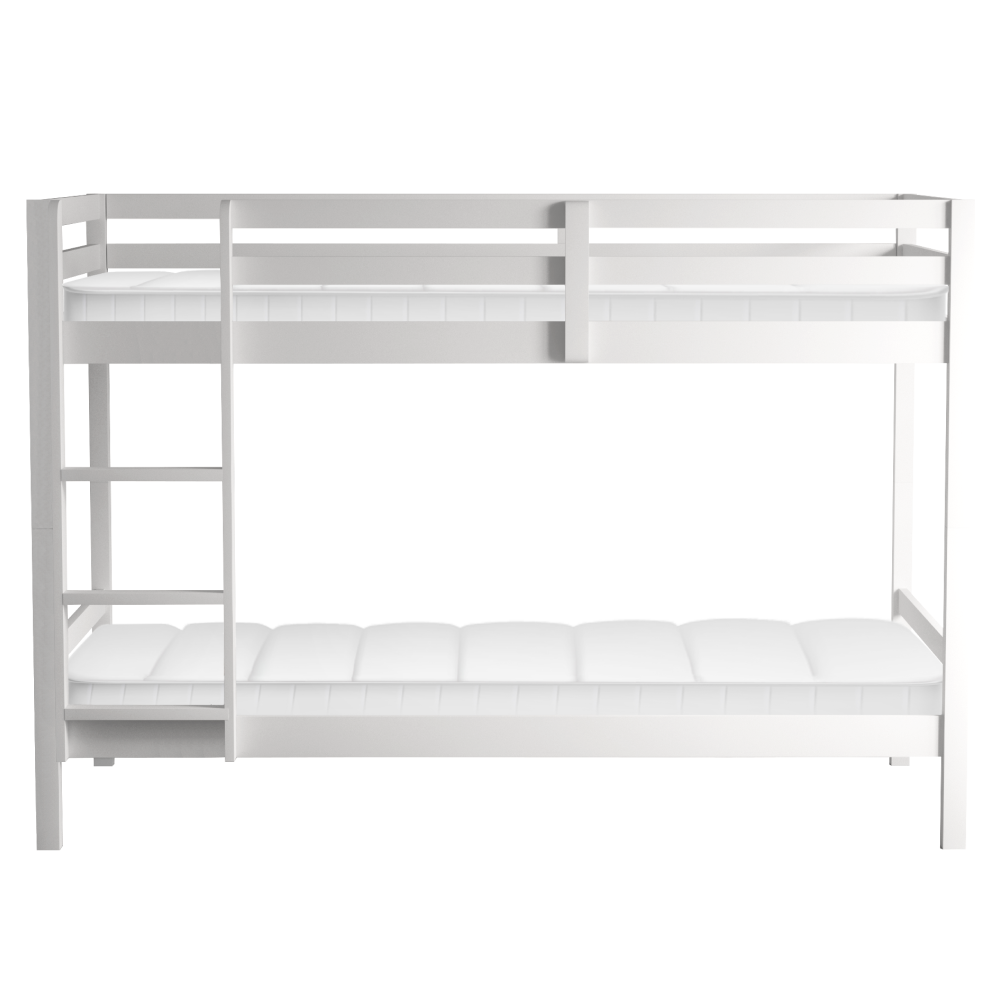 Materiál: borové dřevo Barva: bílá Rozměry (ŠxHxV): 208x101x140 cm Plocha na spaní (ŠxH): 90x200 cm Výška mezi spodním a horním lůžkem: 75 cm Tloušťka materiálu: 2 cm Nosnost na horní lůžko: 90 kg Nosnost na dolní lůžko: 95 kg Doporučená výška matrace na spodní lůžko: 20 cm Doporučená výška matrace na horní lůžko: 14 cm Na nožičkách Výška nožiček spodní lůžko: 21 cm Výška nožiček horní lůžko: 35 cm Tloušťka materiálu nohy: 5x5 cm Hrany postele jsou zaoblené Dodáváno s žebříkem Možnost upevnit žebřík na pravé nebo levé straně Horní postel se zábranou proti pádu Rozložitelná na dvě lůžka Dodáváno s rolovaným roštem Dodáváno bez matrace Možnost zakoupit pružinové matrace z naší nabídky Použité barvy a laky splňují všechny stanovené normy a nezávadnosti Dodáváno v demontu