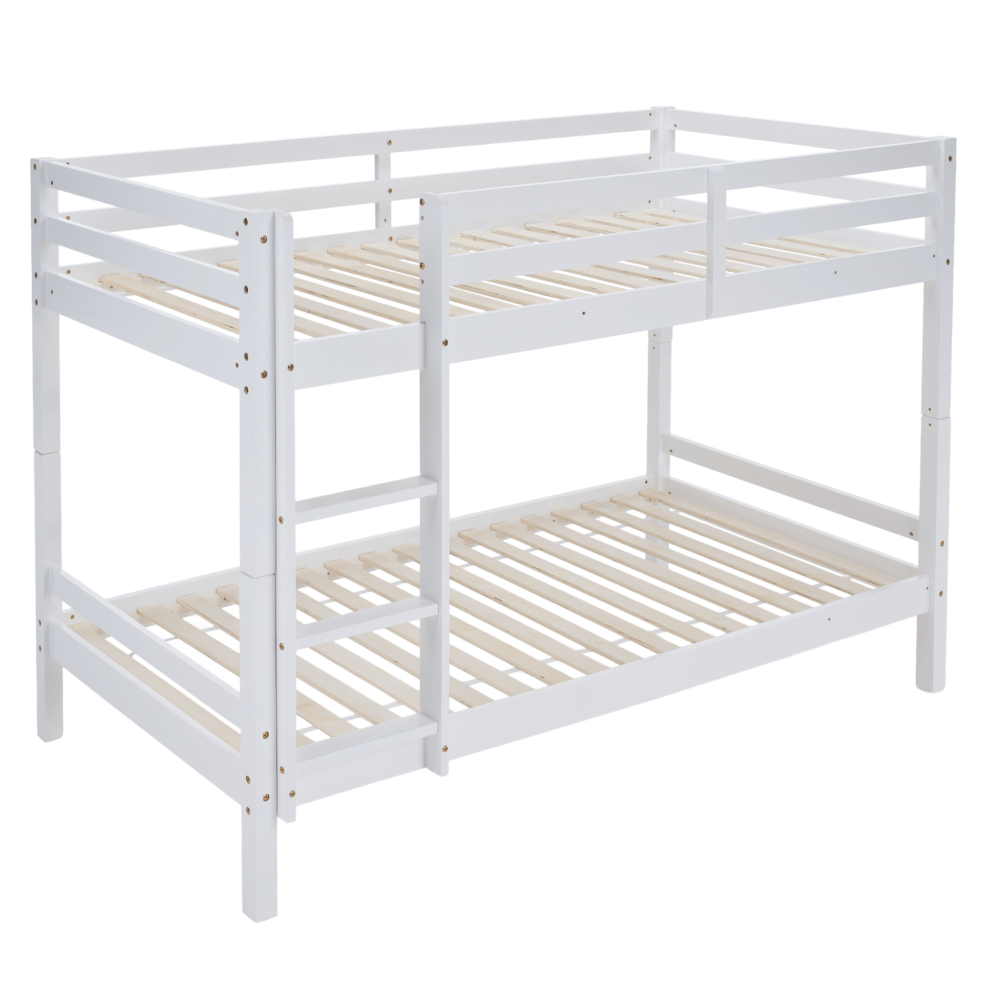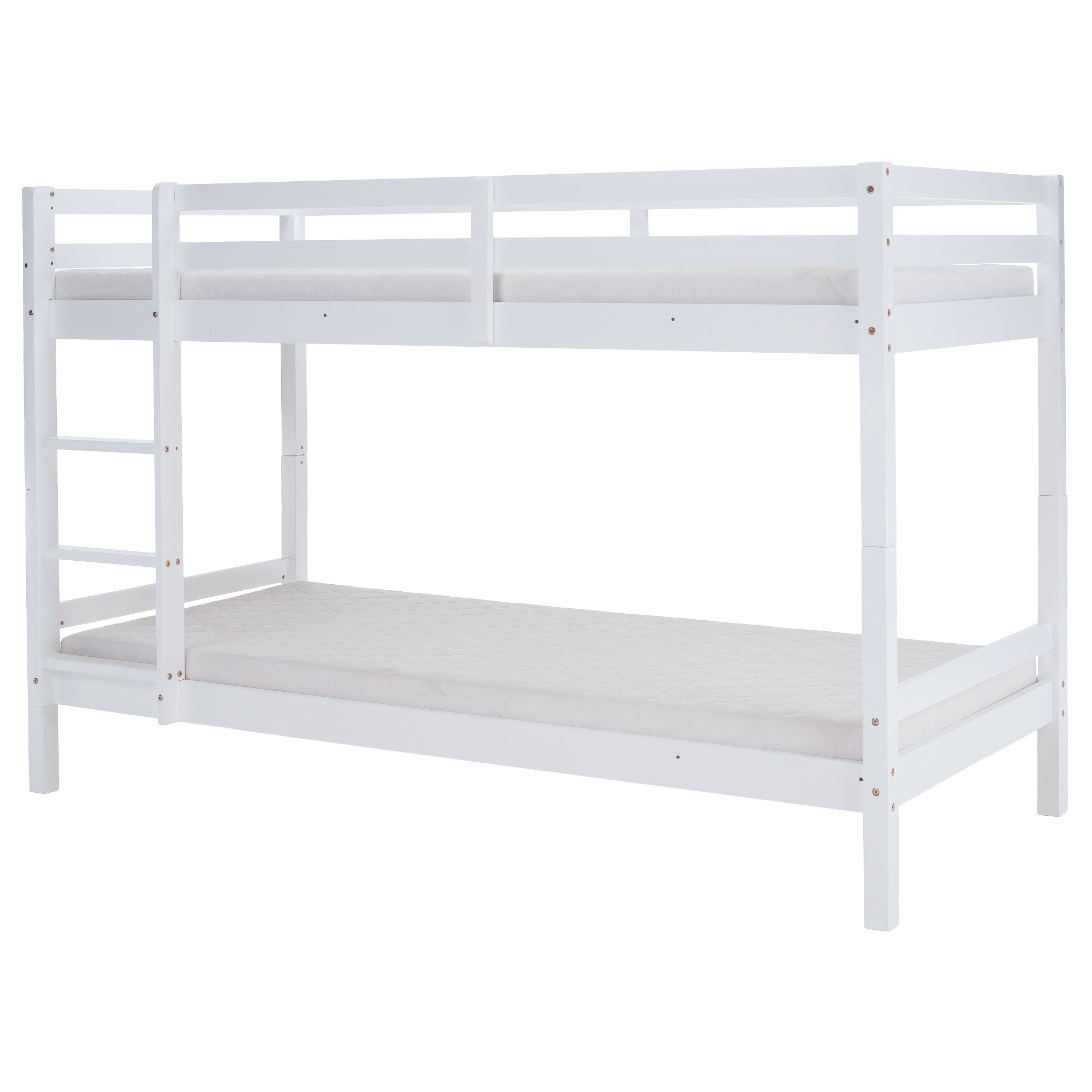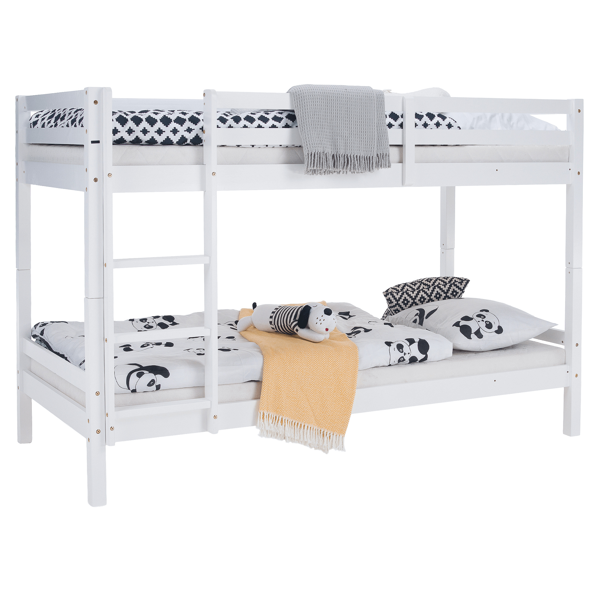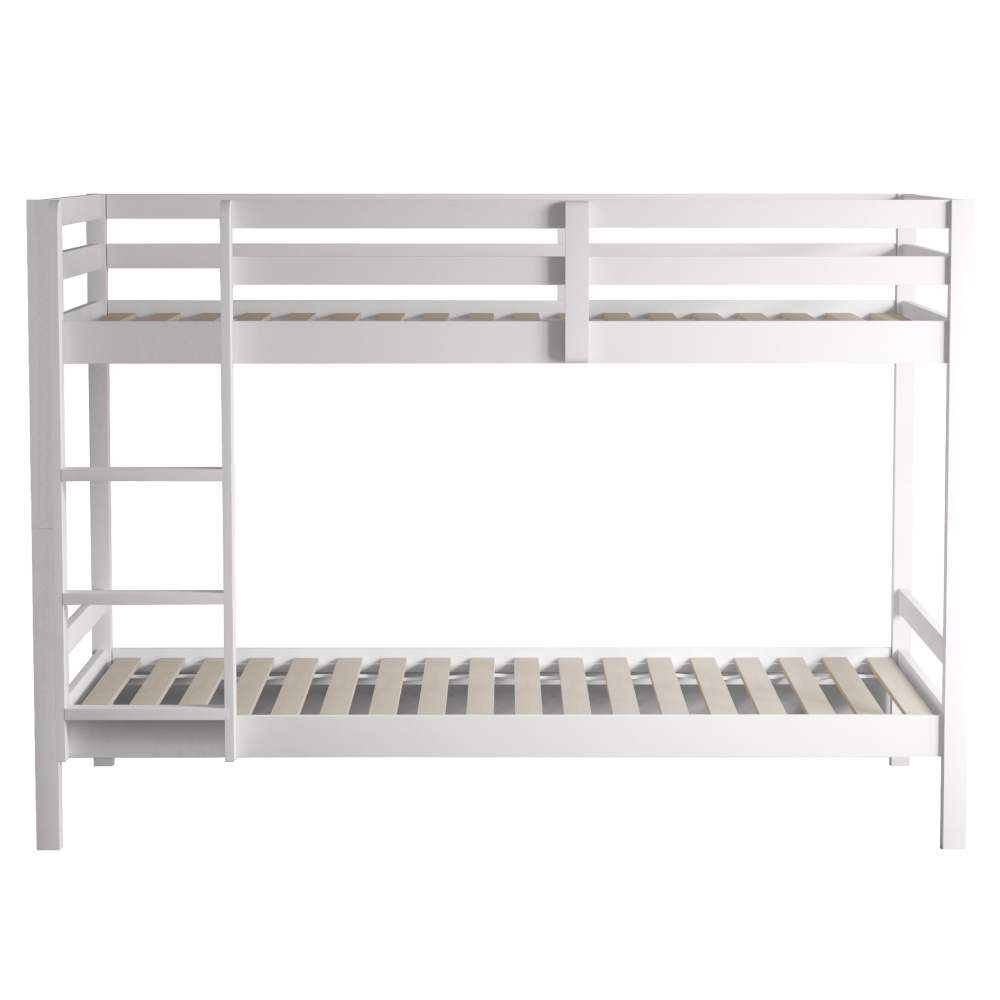 Materiál: borové dřevo Barva: bílá Rozměry (ŠxHxV): 208x101x140 cm Plocha na spaní (ŠxH): 90x200 cm Výška mezi spodním a horním lůžkem: 75 cm Tloušťka materiálu: 2 cm Nosnost na horní lůžko: 90 kg Nosnost na dolní lůžko: 95 kg Doporučená výška matrace na spodní lůžko: 20 cm Doporučená výška matrace na horní lůžko: 14 cm Na nožičkách Výška nožiček spodní lůžko: 21 cm Výška nožiček horní lůžko: 35 cm Tloušťka materiálu nohy: 5x5 cm Hrany postele jsou zaoblené Dodáváno s žebříkem Možnost upevnit žebřík na pravé nebo levé straně Horní postel se zábranou proti pádu Rozložitelná na dvě lůžka Dodáváno s rolovaným roštem Dodáváno bez matrace Možnost zakoupit pružinové matrace z naší nabídky Použité barvy a laky splňují všechny stanovené normy a nezávadnosti Dodáváno v demontu