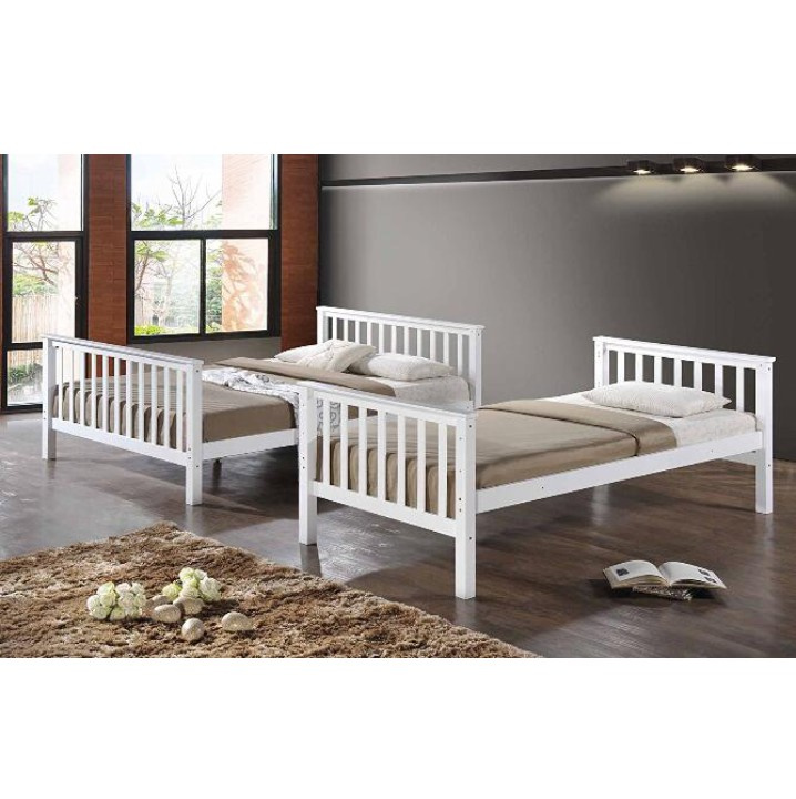 Materiál: masivní borovicové dřevo / překližka Barva: bílá Rozměry (ŠxHxV): 208x98x228 cm Plocha na spaní (ŠxH): 90x200 cm Výška po rošt spodní lůžko: 5,5 cm Výška po rošt horní lůžko: 91,5 cm Max. výška matrace horní lůžko: 14 cm S žebříkem S bezpečnostní bariérou Dodávané s rolováním rošty Dodávané bez matrace Možnost dokoupit matrace D