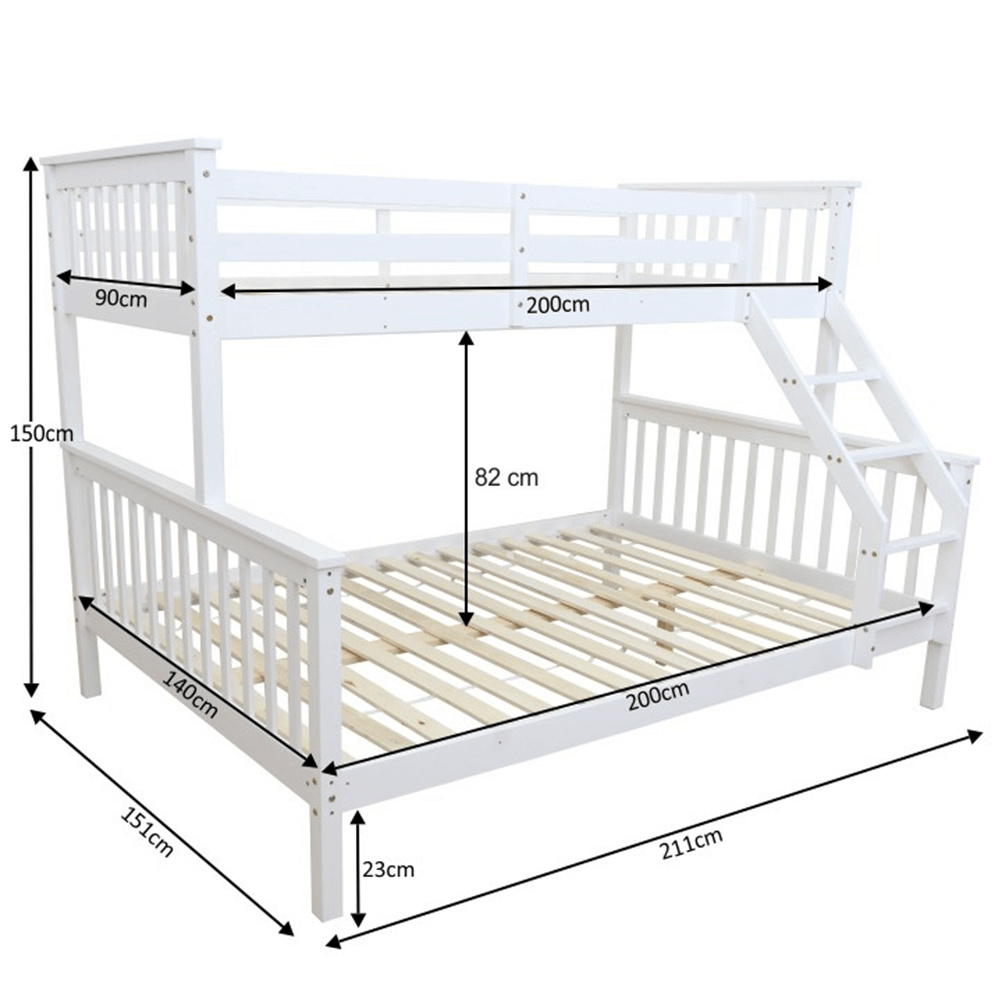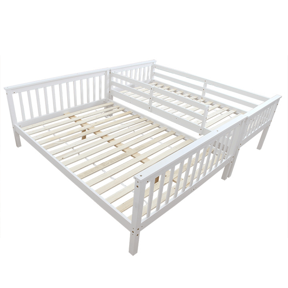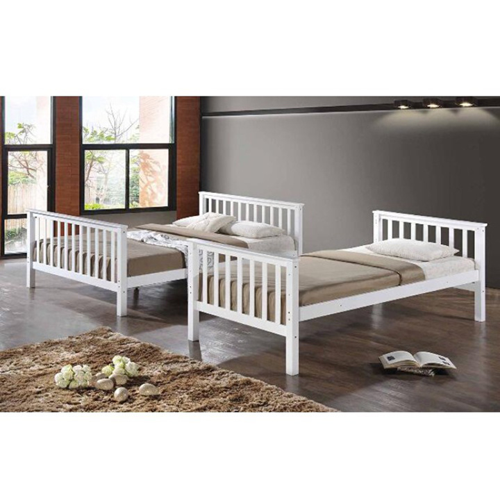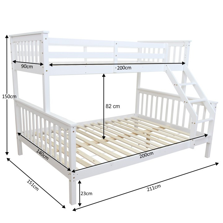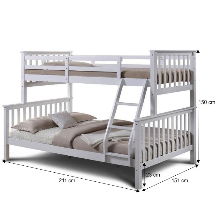 Dvoupatrová rozložitelná postel s roštem BAGIRA Barva: bílá Materiál: borovicové dřevo / překližka (rošt) Rozměry (ŠxHxV): 211x151x150 cm Plocha na spaní dolní lůžko (ŠxH): 140x200 cm Plocha na spaní horní lůžko (ŠxH): 90x200 cm Výška po rošt spodního lůžka: 23 cm Lůžka mají po rozložení odlišnou výšku Maximální výška matrace na horní lůžko: 14 cm Tloušťka materiálu: 20 mm Tloušťka materiálu nohou (ŠxH): 50x50 mm Nosnost horní lůžko: 80 kg Nosnost spodní lůžko: 100 kg Dodávané s latkovým roštem. Dodávané v demontu. Vhodné pro 3 osoby