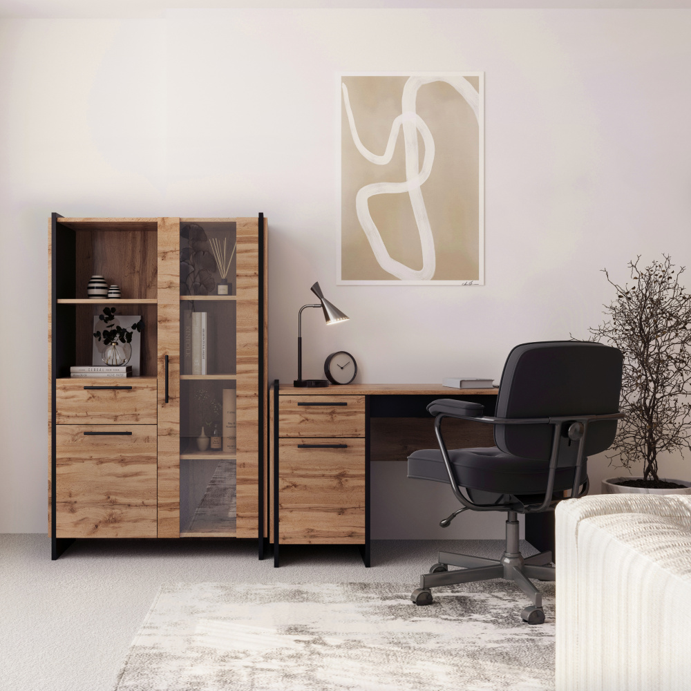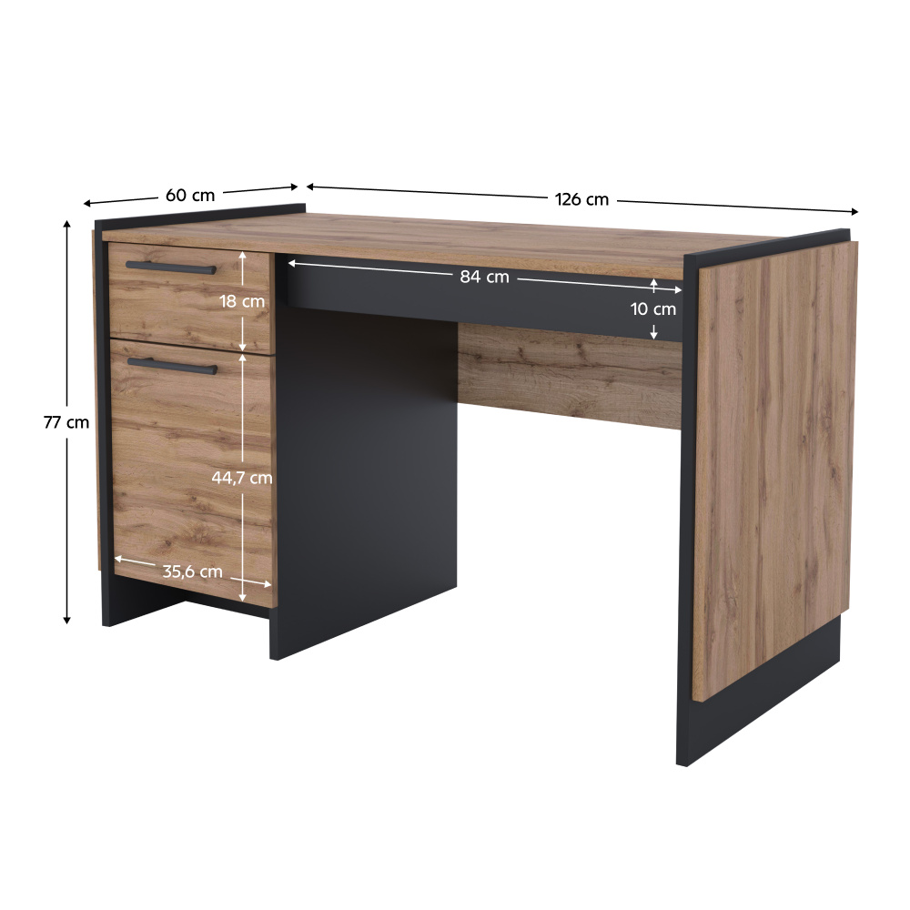 Materiál: DTD laminovaná/ABS hrany Barva: dub wotan/černá Rozměry (ŠxHxV): 126x60x77 cm Tloušťka materiálu: 1,6 cm Kovové úchytky Barva úchytek černá Nosnost vrchní desky: 20 kg Úložný prostor Skříňka s dvířky Police Nosnost police: 5 kg Šuplík Nosnost šuplíku: 5 kg Výška šuplíku: 18 cm S výsuvem na klávesnici Dvojitá laminovaná DTD Plastové nožičky Moderní design Doporučujeme připevnit ke stěně Dodáváno v demontu