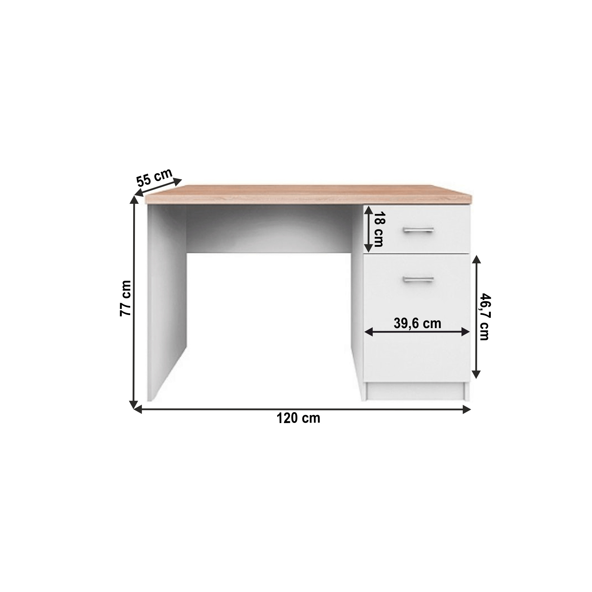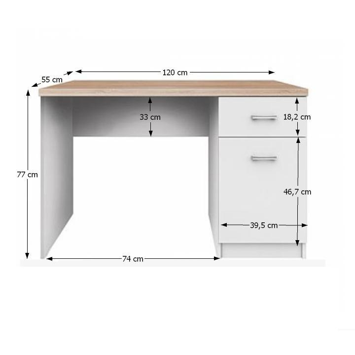 PC stůl 1D1S TOPTY TYP 09 Materiál: DTD laminovaná Provedení: bílá / dub sonoma Rozměry (ŠxHxV): 120x55x77 cm Tloušťka materiálu: 16 mm Dodávané v demontu.