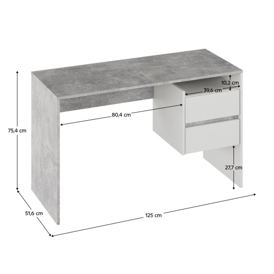 Materiál: DTD laminovaná Barva: beton/bílý mat Rozměry (ŠxHxV): 125x51,6x75,4 cm Tloušťka materiálu: 1,6 cm Šířka prostoru pro židli: 80,4 cm Dva šuplíky Otevřený úložný prostor Nosnost šuplíku: 5 kg Nosnost desky stolu: 35 kg Kvalitní slovenský výrobek Dodáváno v demontu