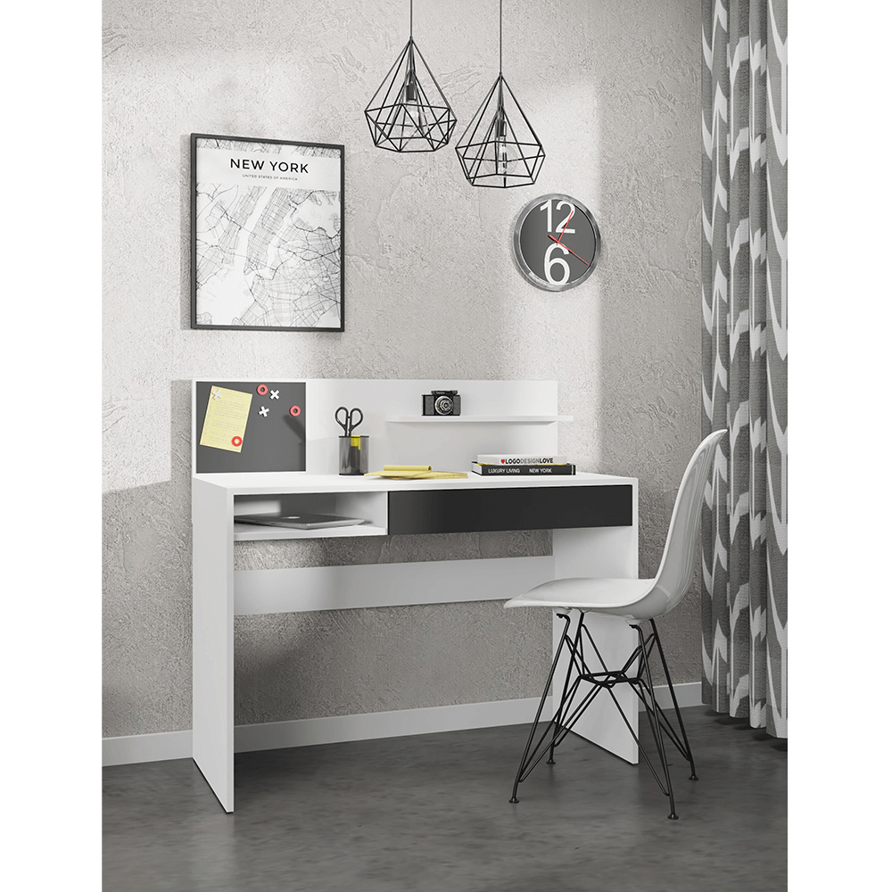 Materiál: DTD laminovaná Barva: bílá / černá Rozměry (ŠxHxV): 110x50x103 cm Tloušťka materiálu: 16 mm se šuplíkem S magnetickou tabulí S policí Otevřený úložný prostor Dodávané v demontu