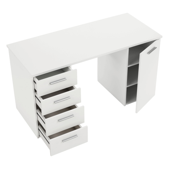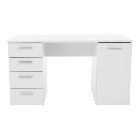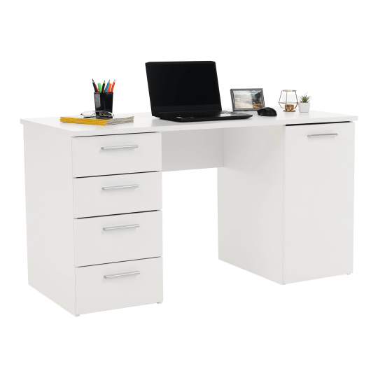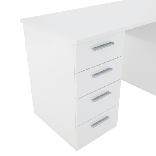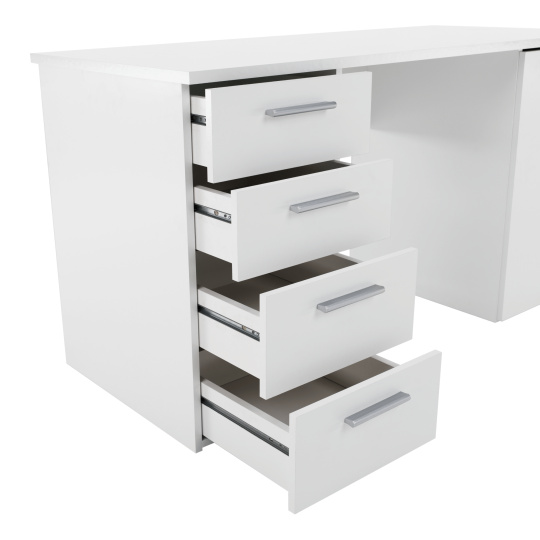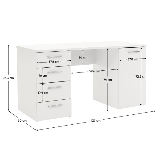 PC stůl Eustach Materiál: DTD laminovaná Barva: bílá Rozměry (ŠxHxV): 137x60x76,3 cm Tloušťka materiálu: 16/22 mm Rozměry skříňky (ŠxHxV): 37,8x60x76,3 cm Čtyři šuplíky, jedna skříňka Výška mělčích šuplíků: 16 cm Výška hlubších šuplíků: 19,4 cm Dodávané v demontu Kvalitní slovenský výrobek