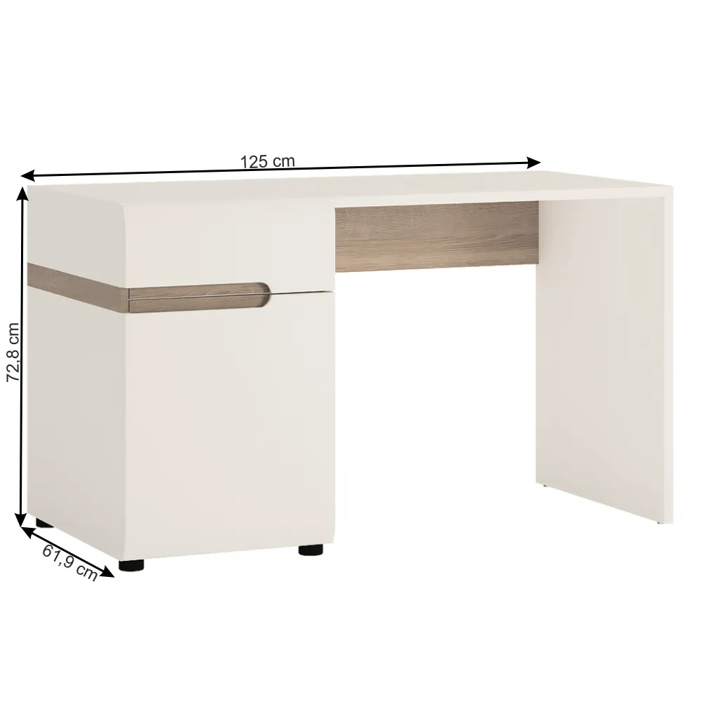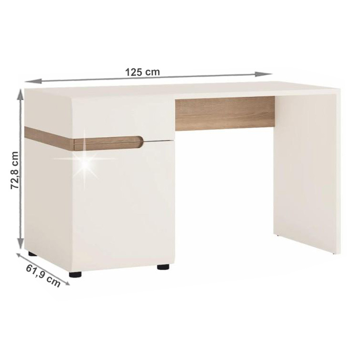PC stůl LYNATET 80 Materiál: laminovaná DTD/fóliovaná MDF Barva: dub sonoma truflový/bílá s extra vysokým leskem Rozměry (ŠxHxV): 125x61,9x72,8 cm Tloušťka materiálu: 16 mm Se šuplíkem Se skříňkou Korpus je v matném provedení Dvířka jsou v provedení extra vysoký lesk Dodáváno v demontu