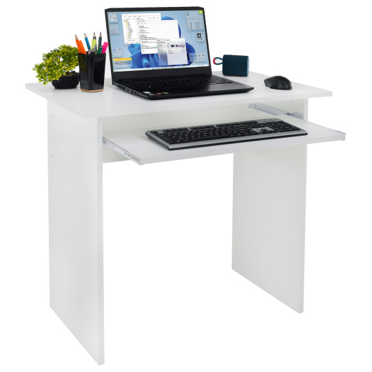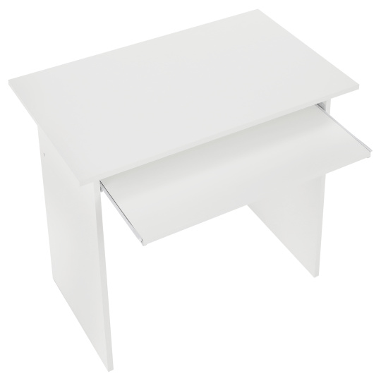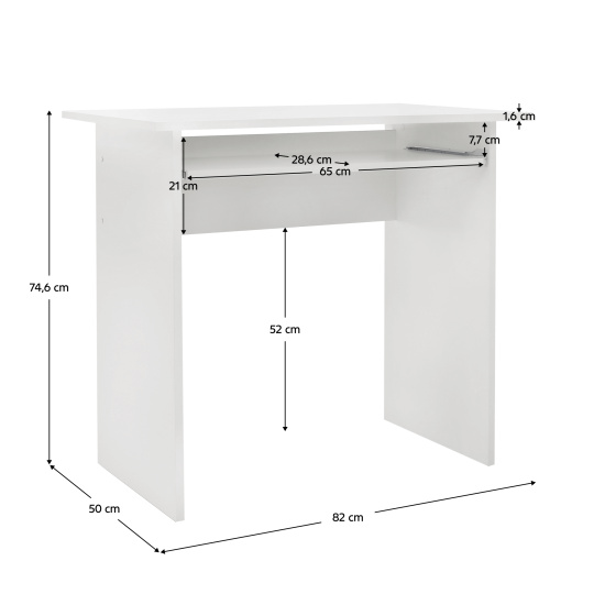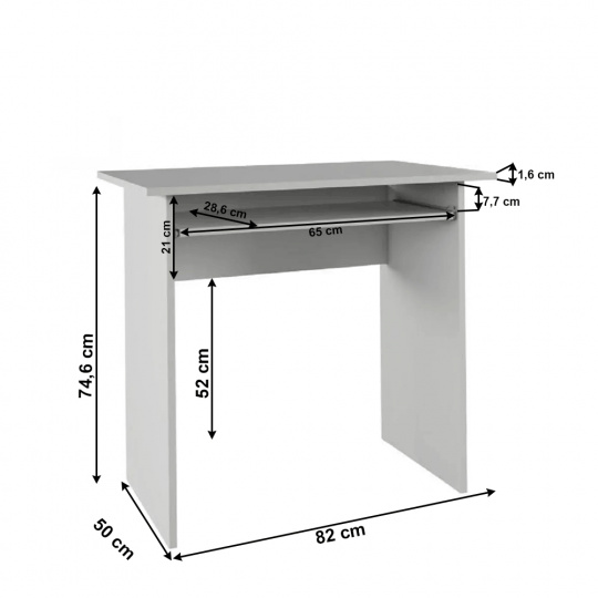PC stůl, provedení: bílá, materiál: DTD laminovaná, rozměry (ŠxHxV): 82x50x74,6 cm. Dodáván v demontu. S výsuvnou policí Rozměry výsuvné police (ŠxH): 65x28,6 cm Výška volného prostoru mezi výsuvem a vrchní deskou: 7,7 cm Výška zadní stěny: 21 cm Výška volného prostoru po spodní hranu zadní stěny: 52 cm Tloušťka materiálu: 16 mm