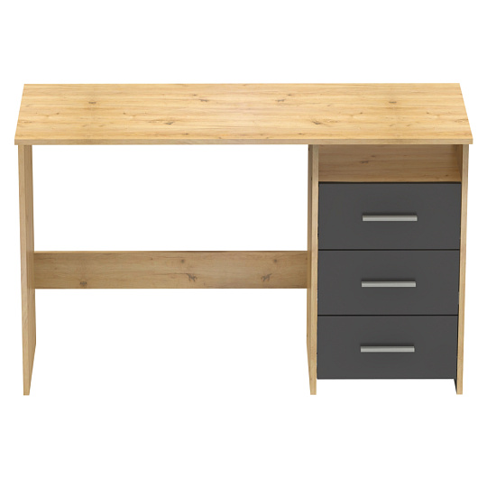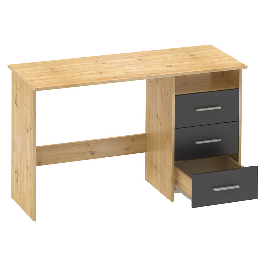Materiál: DTD laminovaná Barva: dub artisan/grafit Stůl (ŠxHxV): 123x50x76,9 cm Šuplík (ŠxV): 38,6x18,8 cm Otevřený prostor (ŠxV): 38,6x13 cm Tloušťka materiálu: 1,6 cm 3 šuplíky Otevřený úložný prostor Police Nosnost: 35 kg Nosnost police: 5 kg Nosnost zásuvka: 5 kg Univerzální Zásuvky umíte namontovat z pravé nebo levé strany S úchytkami Materiál úchytek: plast Barva úchytek: stříbrná Kluzáky Kvalitní slovenský výrobek Dodáváno v demontu