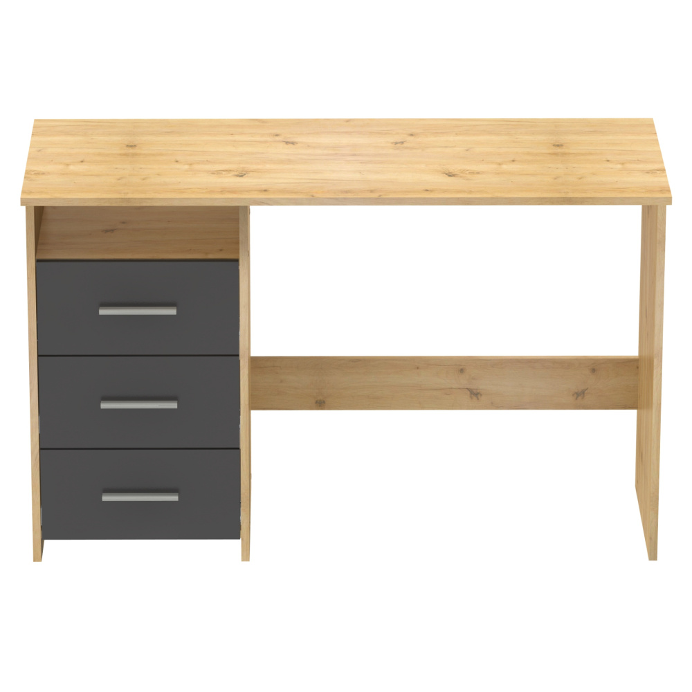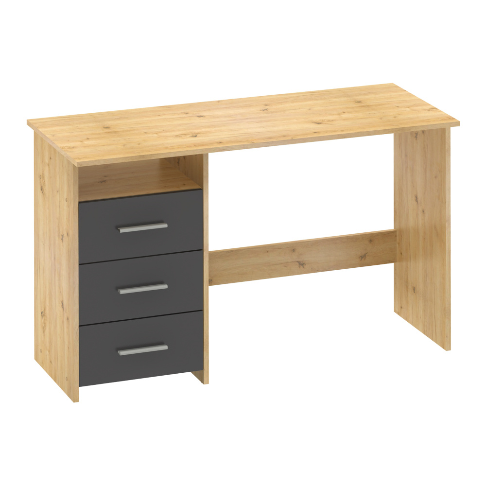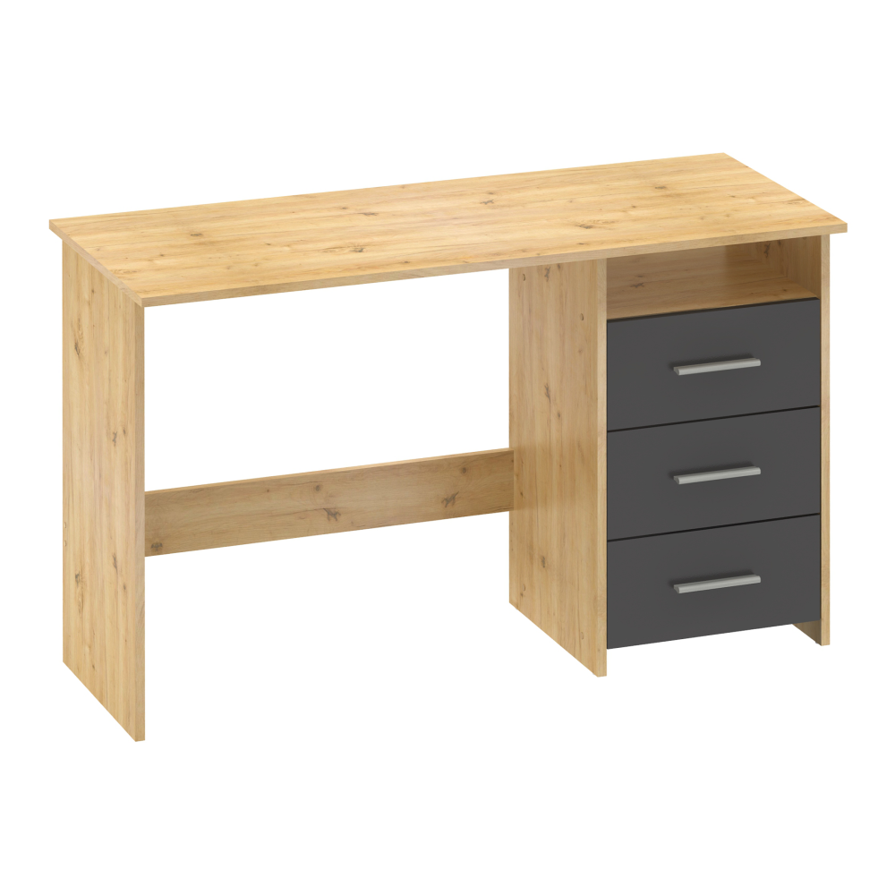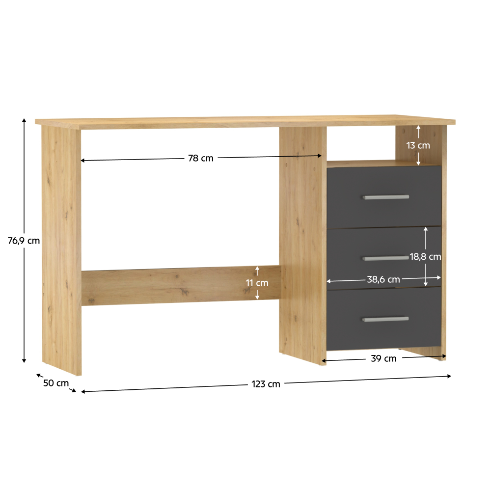 Materiál: DTD laminovaná Barva: dub artisan/grafit Stůl (ŠxHxV): 123x50x76,9 cm Šuplík (ŠxV): 38,6x18,8 cm Otevřený prostor (ŠxV): 38,6x13 cm Tloušťka materiálu: 1,6 cm 3 šuplíky Otevřený úložný prostor Police Nosnost: 35 kg Nosnost police: 5 kg Nosnost zásuvka: 5 kg Univerzální Zásuvky umíte namontovat z pravé nebo levé strany S úchytkami Materiál úchytek: plast Barva úchytek: stříbrná Kluzáky Kvalitní slovenský výrobek Dodáváno v demontu