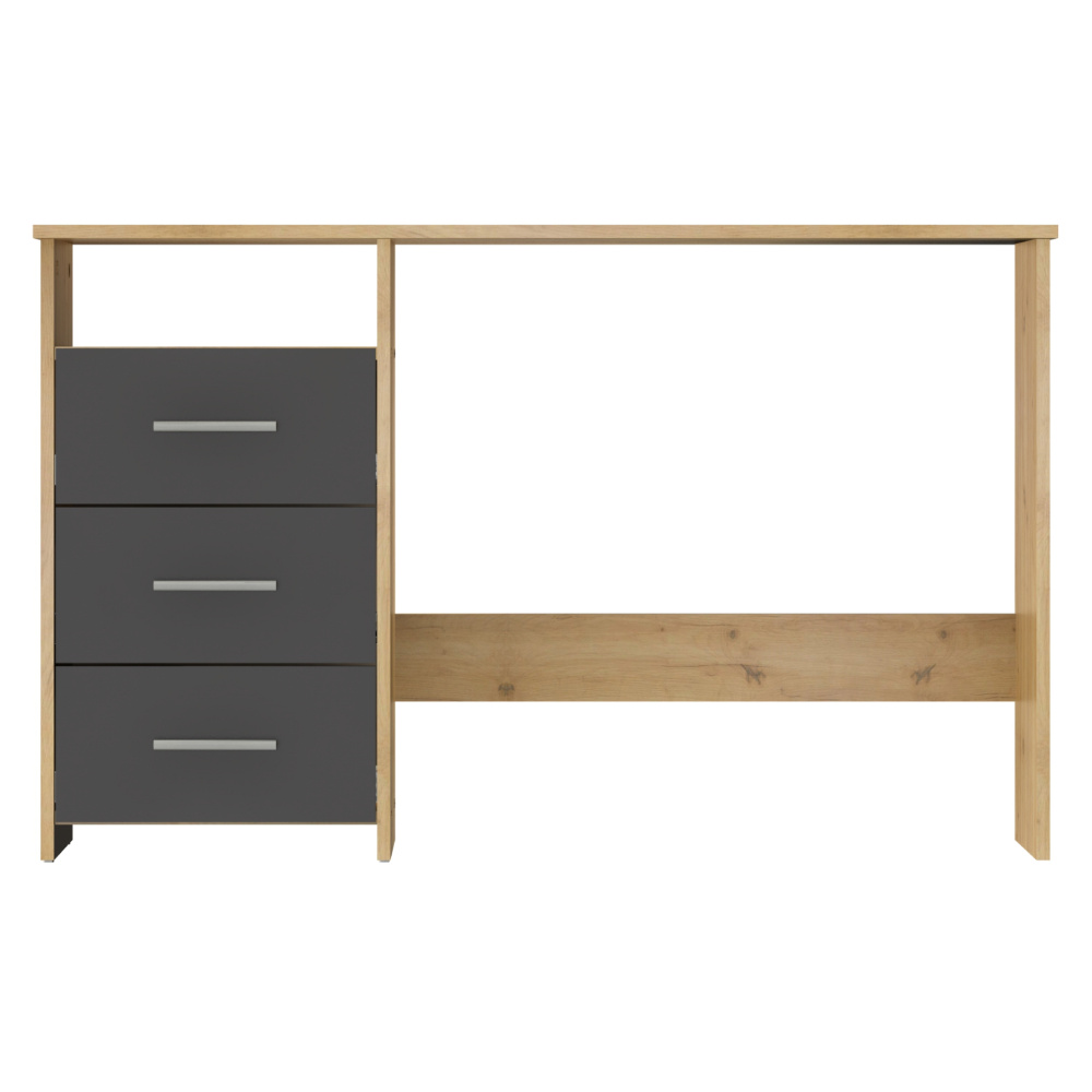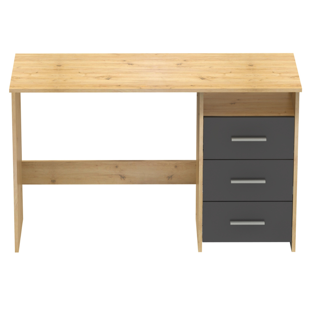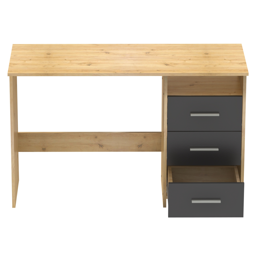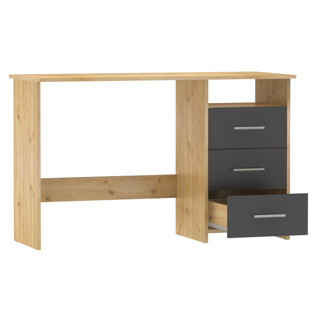 Materiál: DTD laminovaná Barva: dub artisan/grafit Stůl (ŠxHxV): 123x50x76,9 cm Šuplík (ŠxV): 38,6x18,8 cm Otevřený prostor (ŠxV): 38,6x13 cm Tloušťka materiálu: 1,6 cm 3 šuplíky Otevřený úložný prostor Police Nosnost: 35 kg Nosnost police: 5 kg Nosnost zásuvka: 5 kg Univerzální Zásuvky umíte namontovat z pravé nebo levé strany S úchytkami Materiál úchytek: plast Barva úchytek: stříbrná Kluzáky Kvalitní slovenský výrobek Dodáváno v demontu
