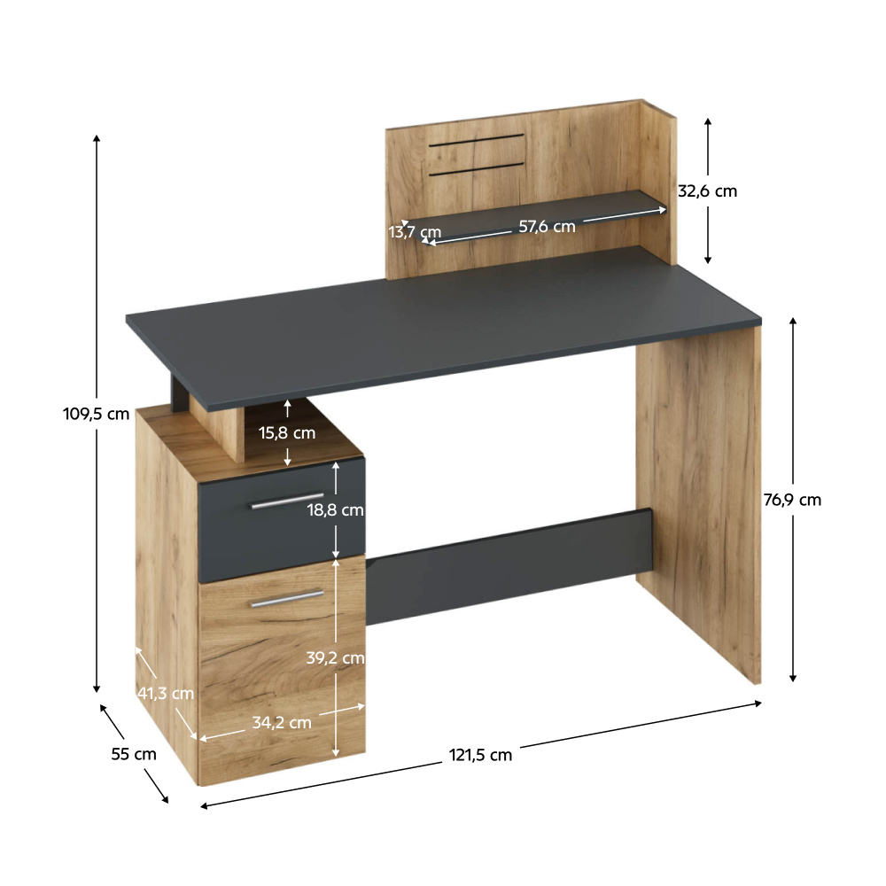 Materiál: laminovaná DTD Barva: dub artisan/grafit Celkové rozměry (ŠxHxV):121,5x55x109,5 cm Nosnost desky stolu: 35 kg Rozměry kontejneru (ŠxHxV): 34,2x41,3x58 cm Výška šuplíku: 18,8 cm Tloušťka materiálu: 1,6 cm Otevřený úložný prostor S nástavcem S plastovou úchytkou Barva úchytky: stříbrná Obsahuje polici, šuplík a regál Kvalitní slovenský výrobek Nožičky v podobě kluzáků Dodáváno v demontu