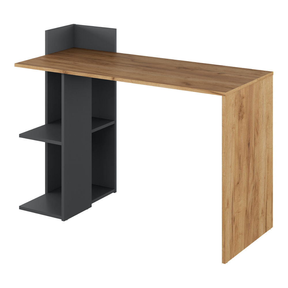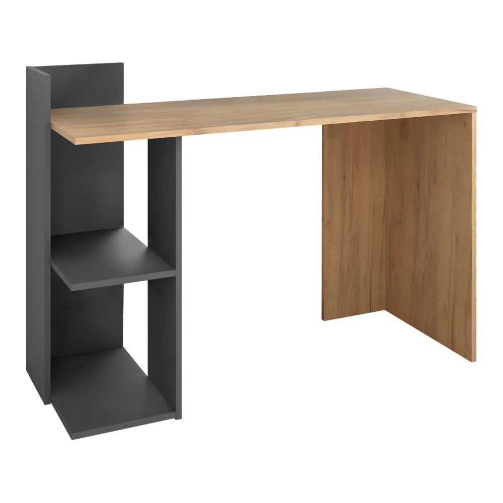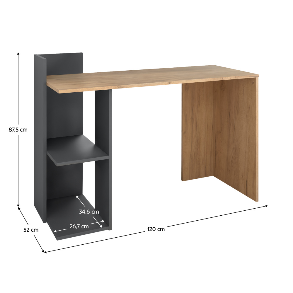 Materiál: DTD laminovaná Barva: dub craft zlatý/grafit Rozměry (ŠxHxV): 120x52x87,5 cm Rozměry police (ŠxH): 26,7x34,6 cm Tloušťka materiálu: 1,6 cm S policemi Nosnost police: 5 kg Nosnost stolu: 35 kg S praktickým otevřeným regálem Dostatek úložného prostoru Postaven na kluzácích Kvalitní slovenský výrobek Dodáváno v demontu