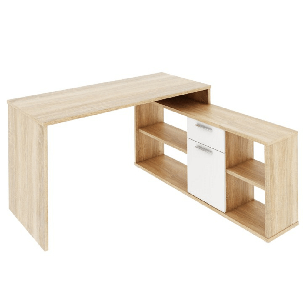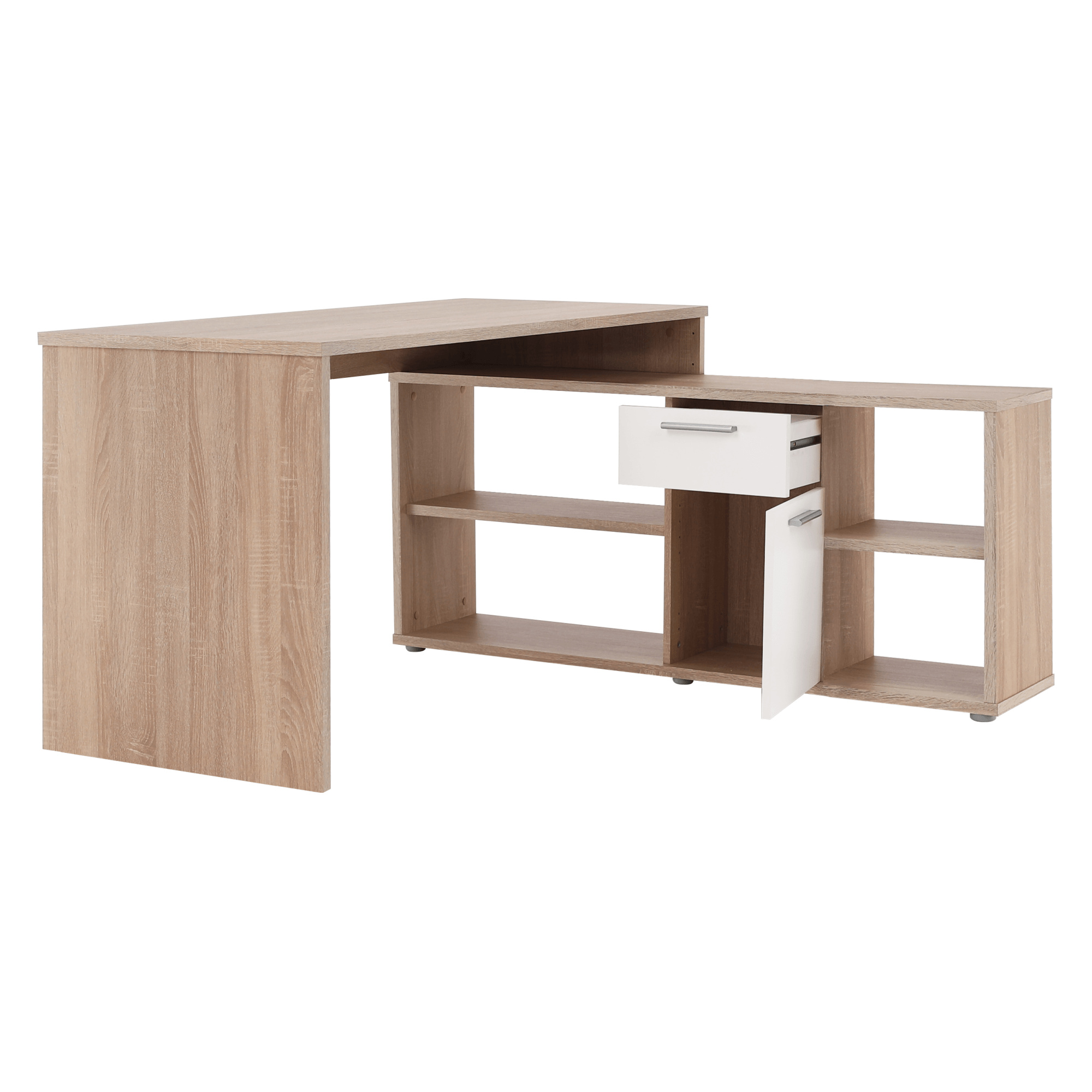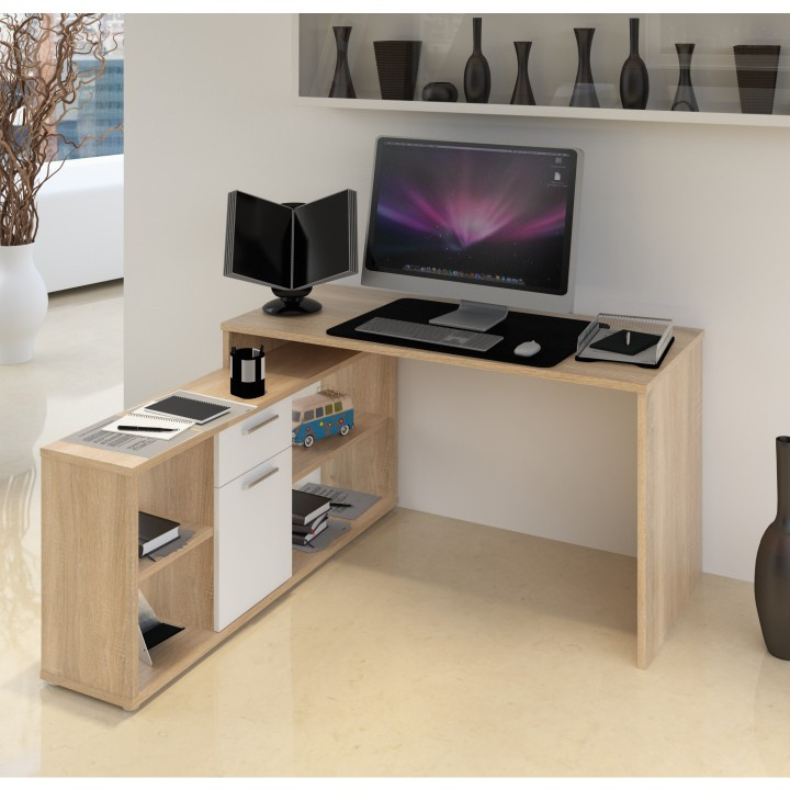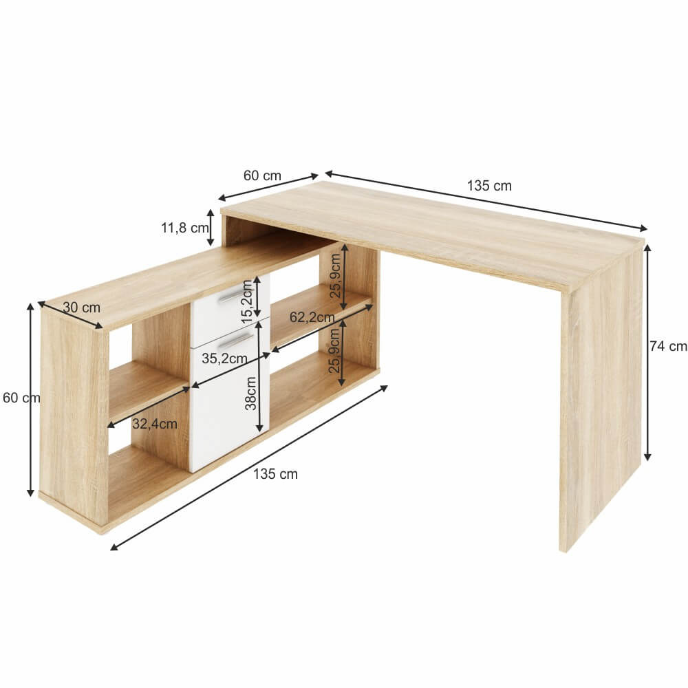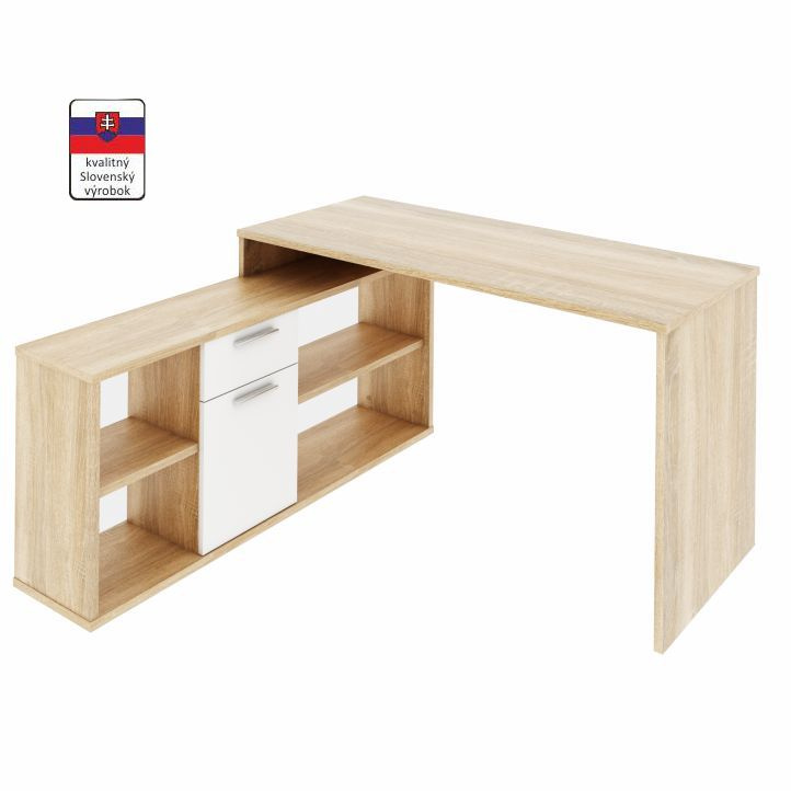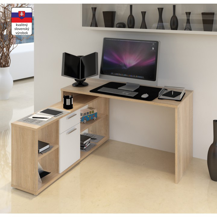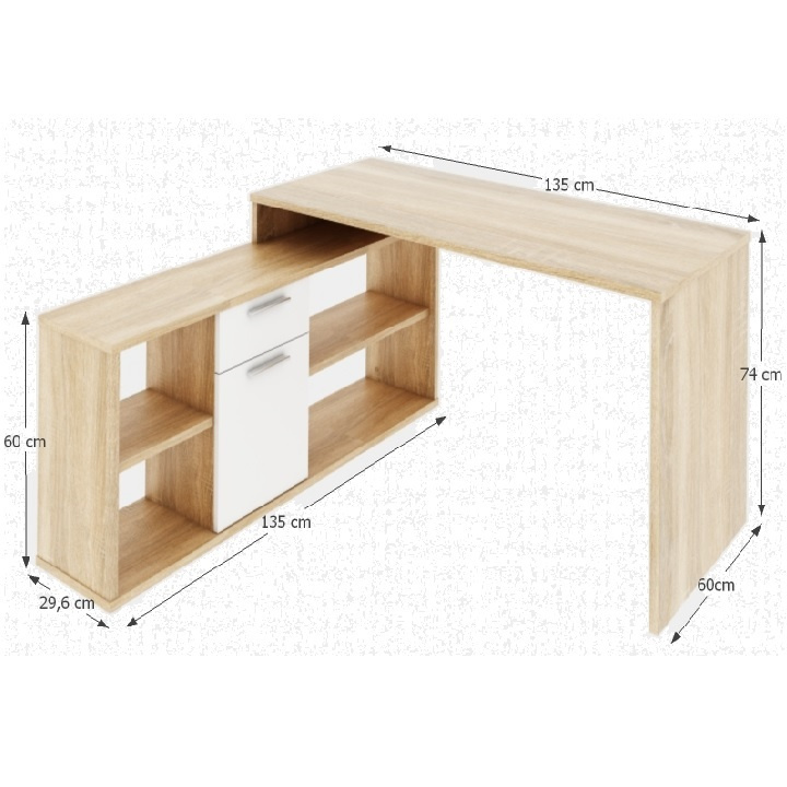PC stůl rohový, materiál DTD fóliovaná. Provedení dub sonoma / bílá. Rozměry (ŠxVxH): 135x74x135 cm Tloušťka materiálu: 16/22 mm