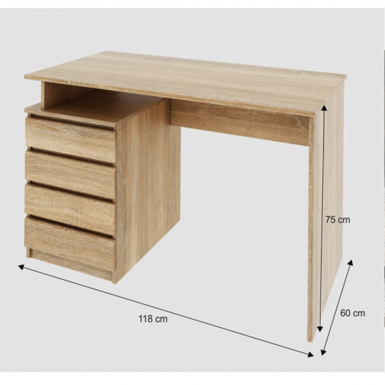 PC stůl se šuplíky HANY NEW Materiál: DTD laminovaná Barva: dub sonoma Rozměry (ŠxHxV): 118x60x75 cm Šířka prostoru na židli: 72,6 cm Výška prostoru na židli: 73 cm Hloubka prostoru na židli: 47,5 cm ABS hrany Tloušťka materiálu: 16 mm Dodávané v demontu.