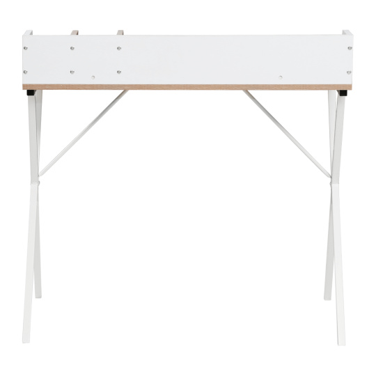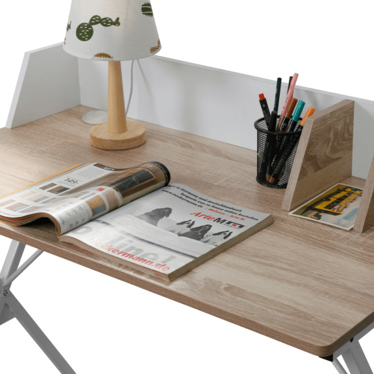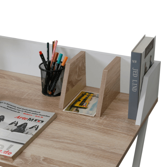 Materiál deska: DTD laminovaná/kov Barva: dub světlý/bílá Rozměry (ŠxHxV): 90x50x85 cm Tloušťka materiálu: 1,5 cm Nosnost: 40 kg Vyvýšená zadní část Otvor na kabely Průměr otvoru pro kabely: 5 cm Organizér na stolové desce Moderní design Víceúčelový stůl Univerzální využití Pracovní/psací stůl Dodáváno v demontu