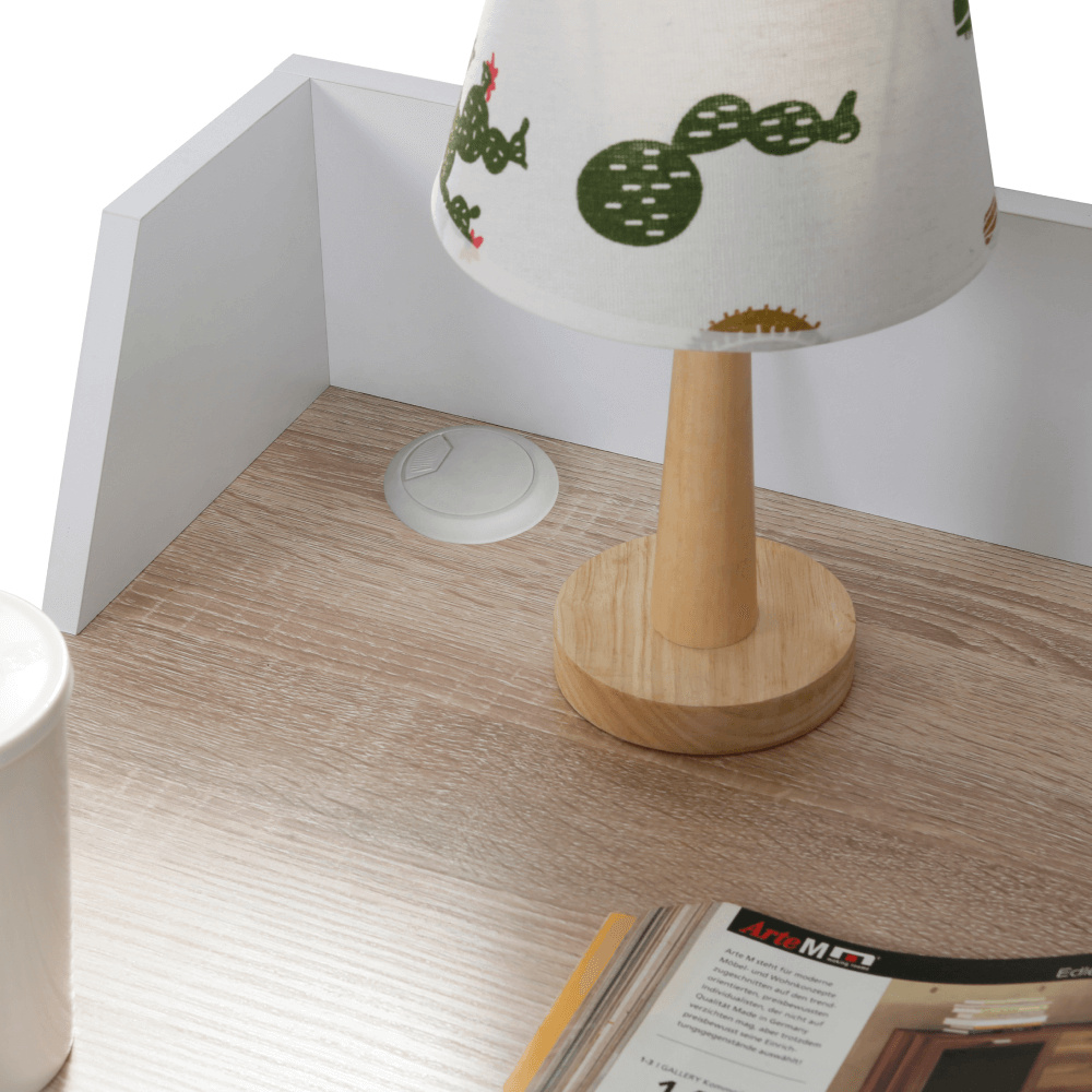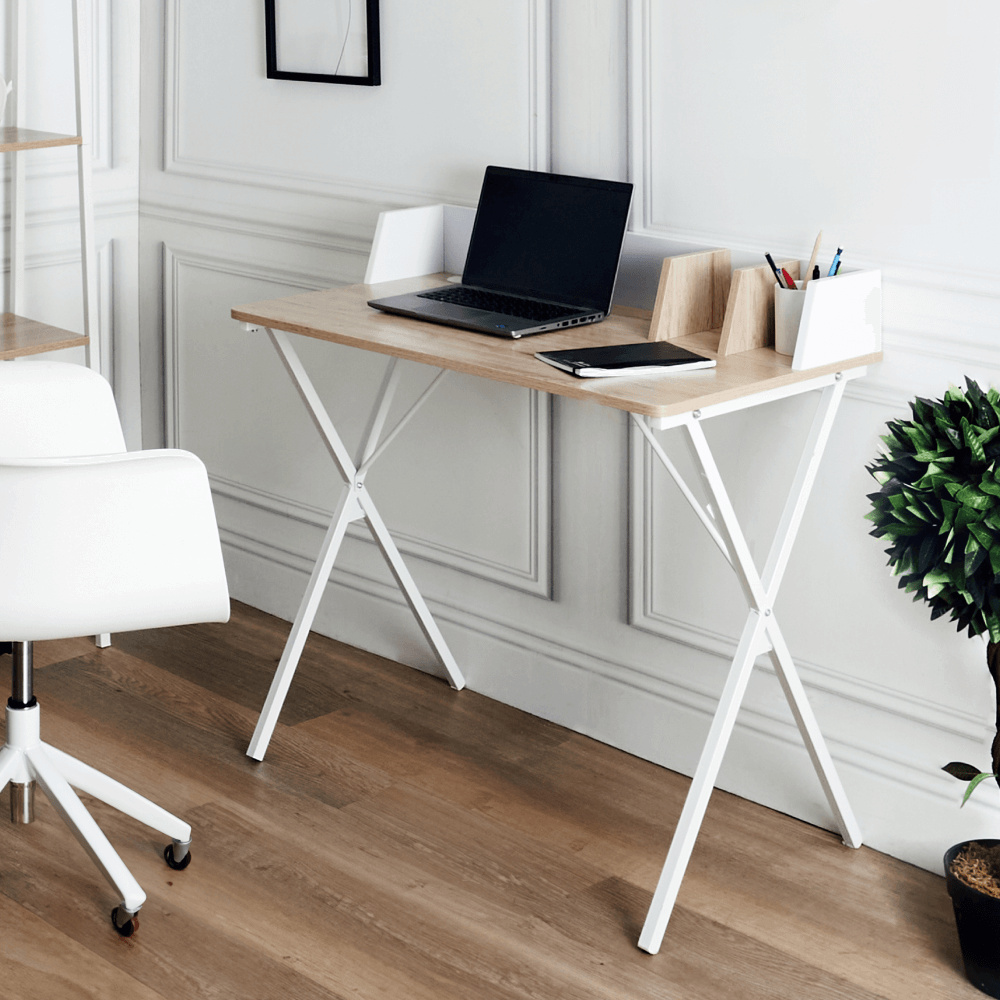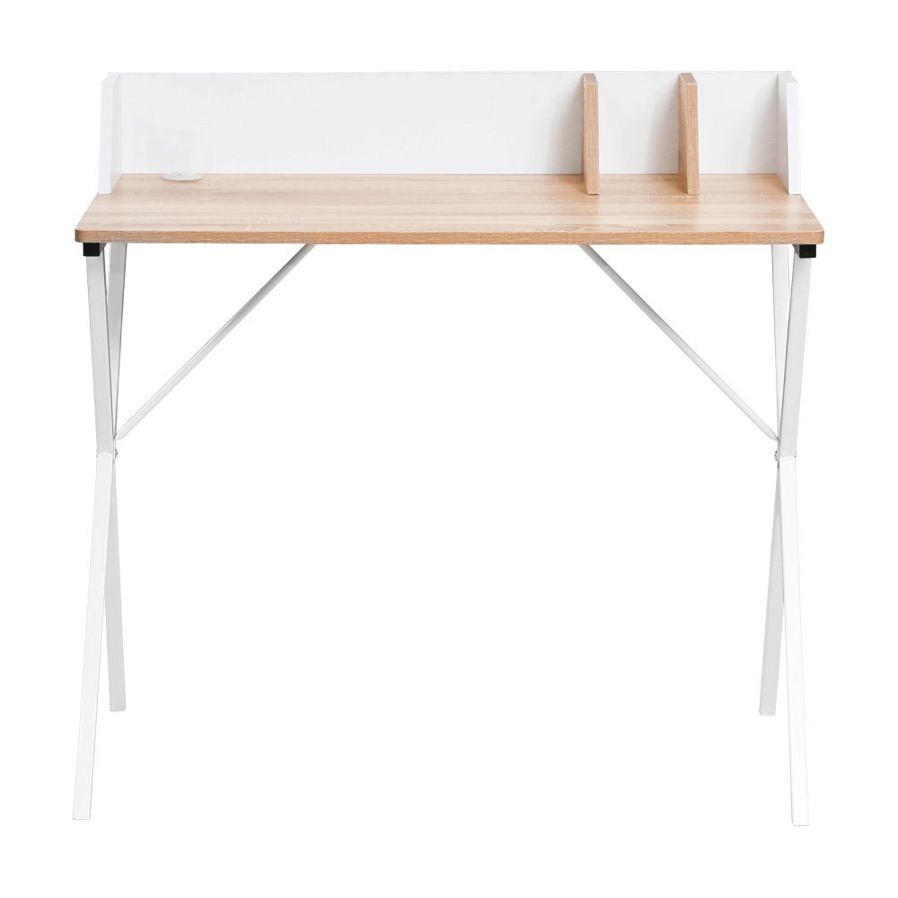 Materiál deska: DTD laminovaná/kov Barva: dub světlý/bílá Rozměry (ŠxHxV): 90x50x85 cm Tloušťka materiálu: 1,5 cm Nosnost: 40 kg Vyvýšená zadní část Otvor na kabely Průměr otvoru pro kabely: 5 cm Organizér na stolové desce Moderní design Víceúčelový stůl Univerzální využití Pracovní/psací stůl Dodáváno v demontu