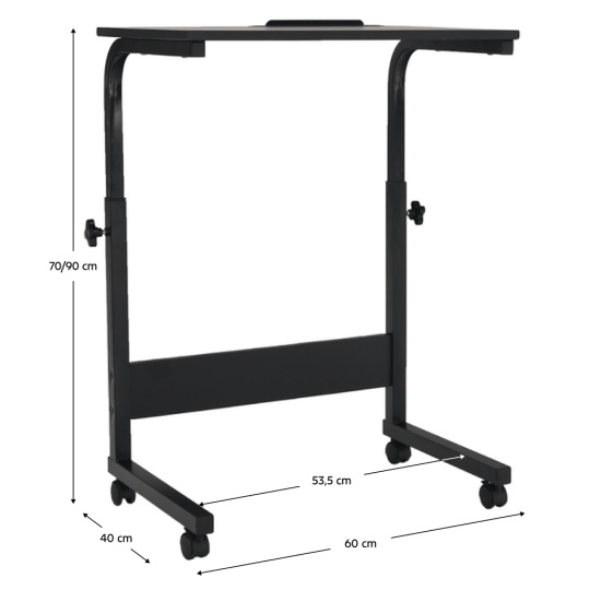 Materiál: MDF s PVC fólií / kov Barva: černá Rozměry (ŠxHxV): 60x40x70-90 cm Nosnost: 15 kg Tloušťka plátu: 1,5 cm pojízdný na kolečkách Se dvěma brzdami Nastavitelná výška stolu Se zářezem na tablet Dodáván v demontu