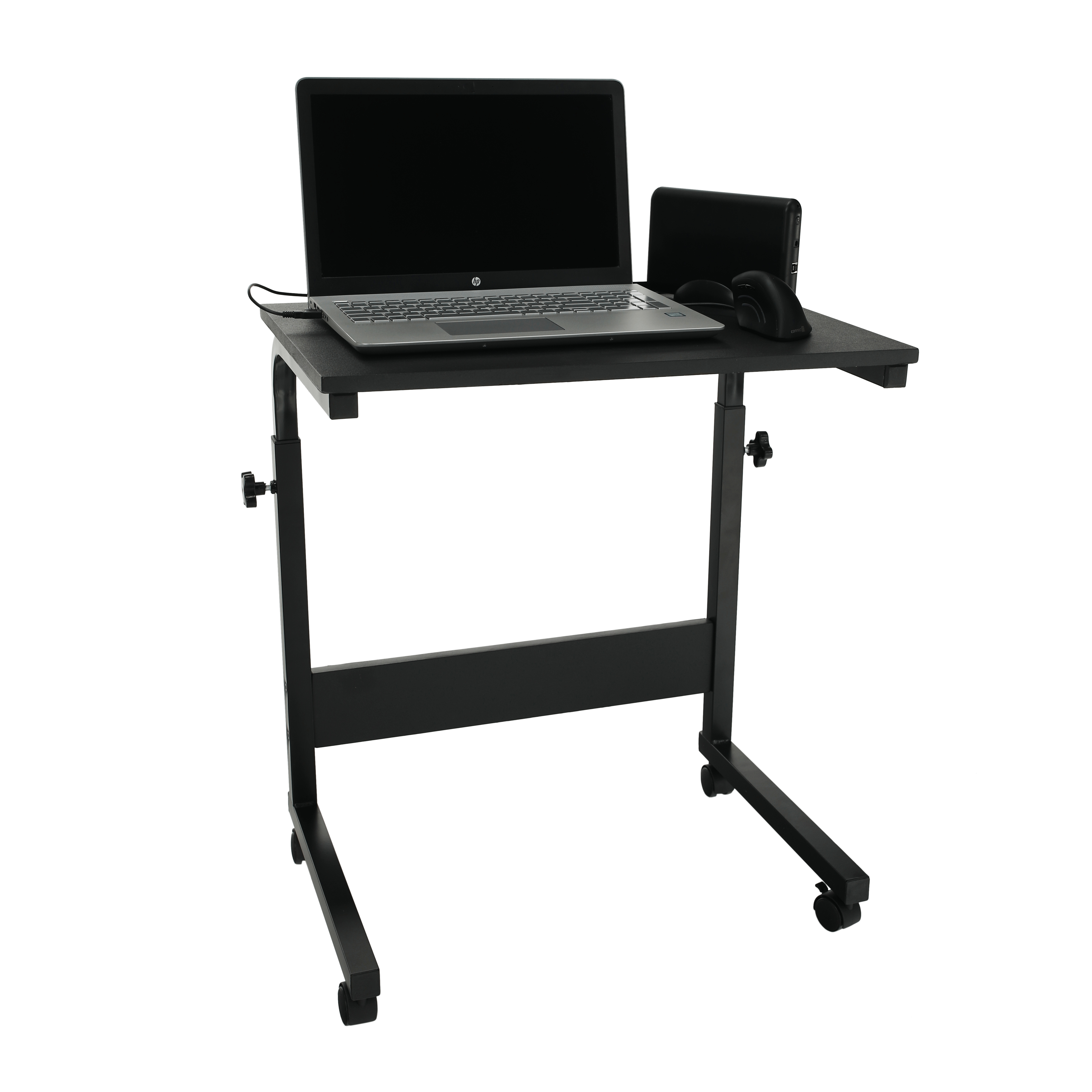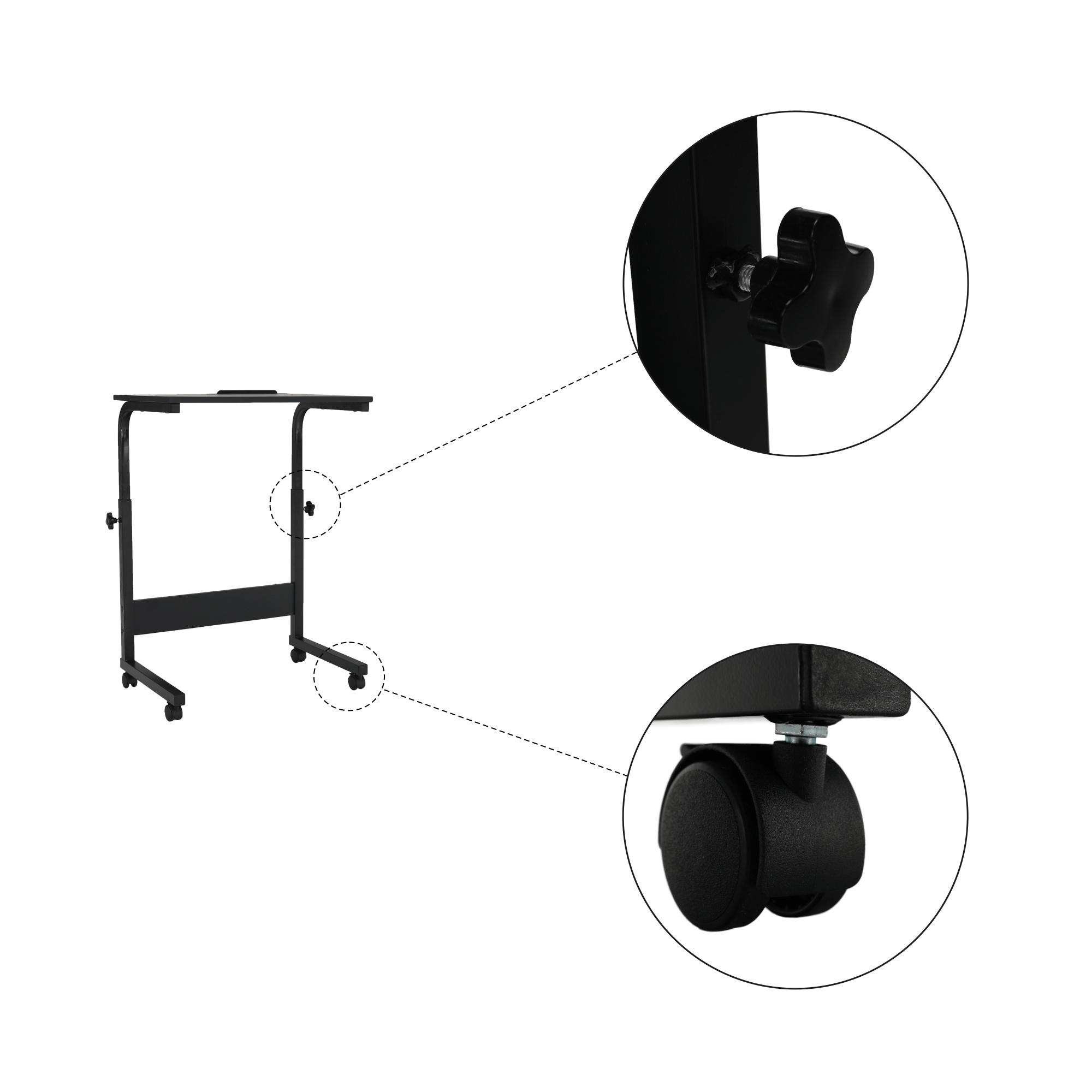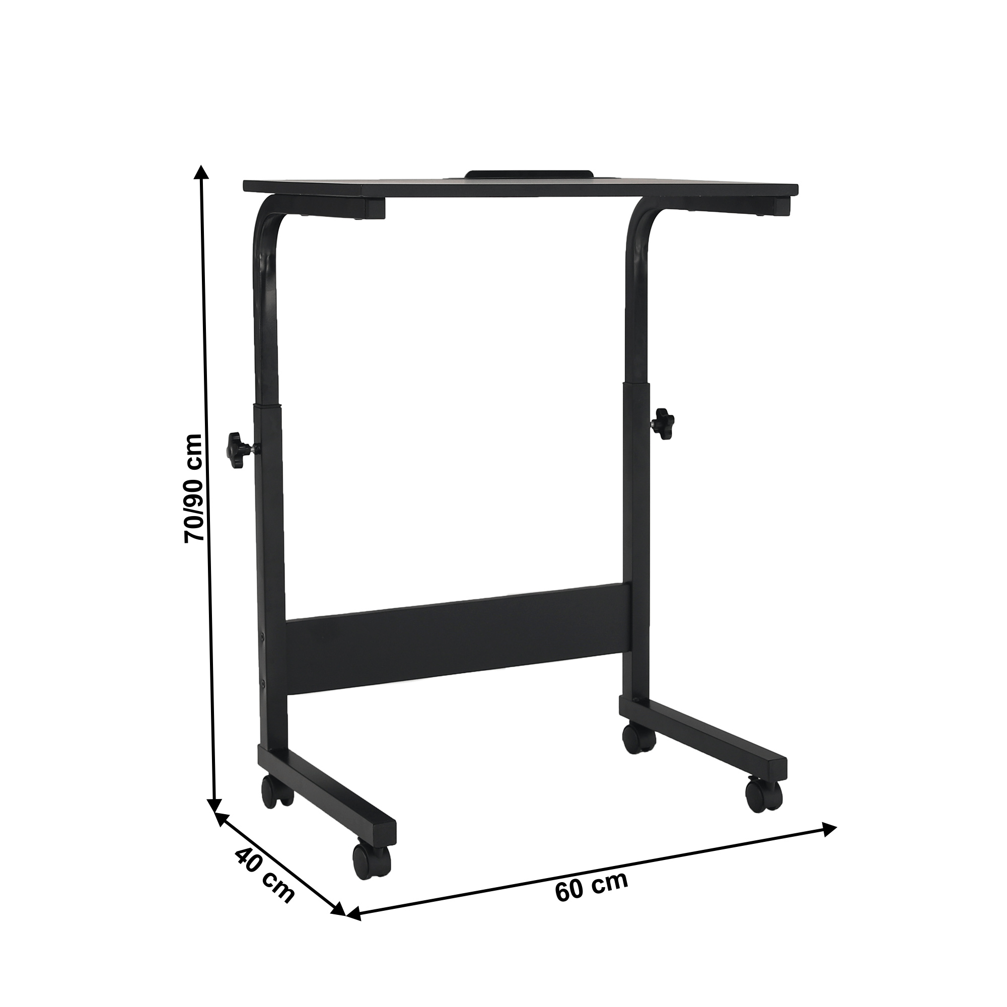 Materiál: MDF s PVC fólií / kov Barva: černá Rozměry (ŠxHxV): 60x40x70-90 cm Nosnost: 15 kg Tloušťka plátu: 1,5 cm pojízdný na kolečkách Se dvěma brzdami Nastavitelná výška stolu Se zářezem na tablet Dodáván v demontu