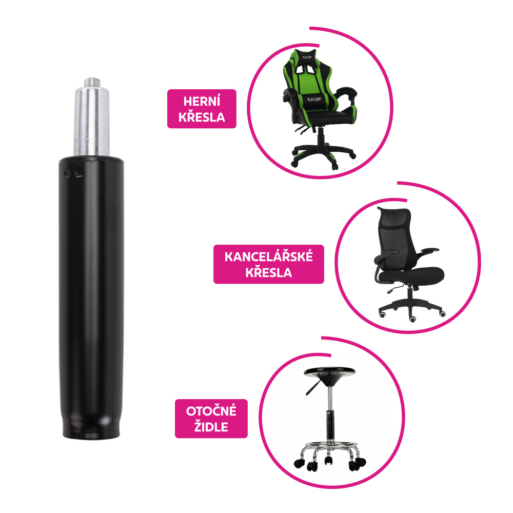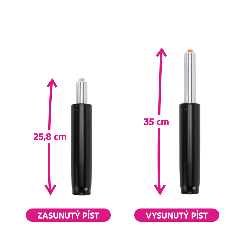 Materiál: kov Barva: černá Průměr pístu: 5 cm Průměr pístnice: 2,8 cm Celková délka pístu: 35 cm Délka těla pístu: 19,5 cm Prodloužení: 9,2 cm Síla pístu: 400 N Nosnost: Max. 150 kg Hmotnost: 0,7 kg Náhradní plynový píst Pro kancelářská křesla Pro kancelářské židle Pro otočné židle