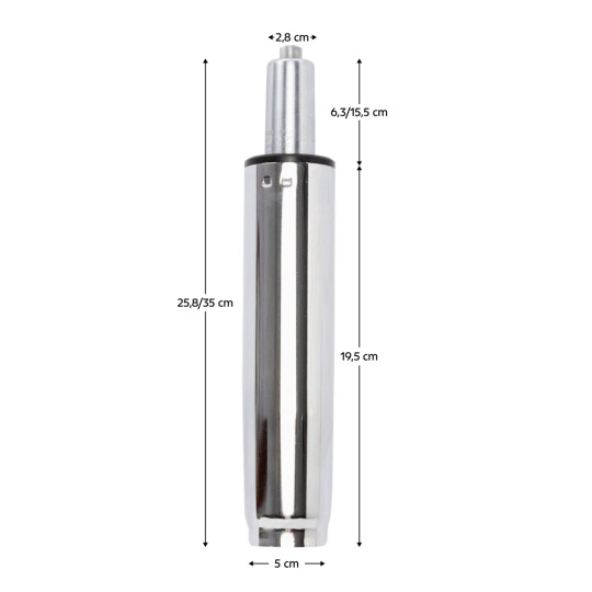 Materiál: kov Barva: chrom Průměr pístu: 5 cm Průměr pístnice: 2,8 cm Celková délka pístu: 35 cm Délka těla pístu: 19,5 cm Prodloužení: 9,2 cm Síla pístu: 400 N Nosnost: Max. 150 kg Hmotnost: 0,7 kg Náhradní plynový píst Pro kancelářská křesla Pro kancelářské židle Pro otočné židle