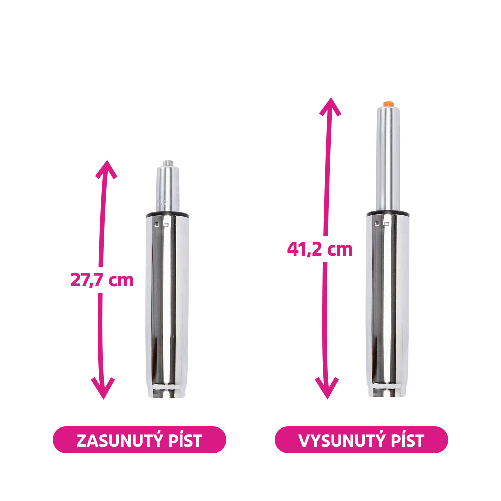 Materiál: kov Barva: chrom Průměr pístu: 5 cm Průměr pístnice: 2,8 cm Celková délka pístu: 41,2 cm Délka těla pístu: 23 cm Prodloužení: 13,5 cm Síla pístu: 350 N Nosnost: max. 150 kg Hmotnost: 0,8 kg Náhradní plynový píst Pro kancelářská křesla Pro kancelářské židle Pro otočné židle