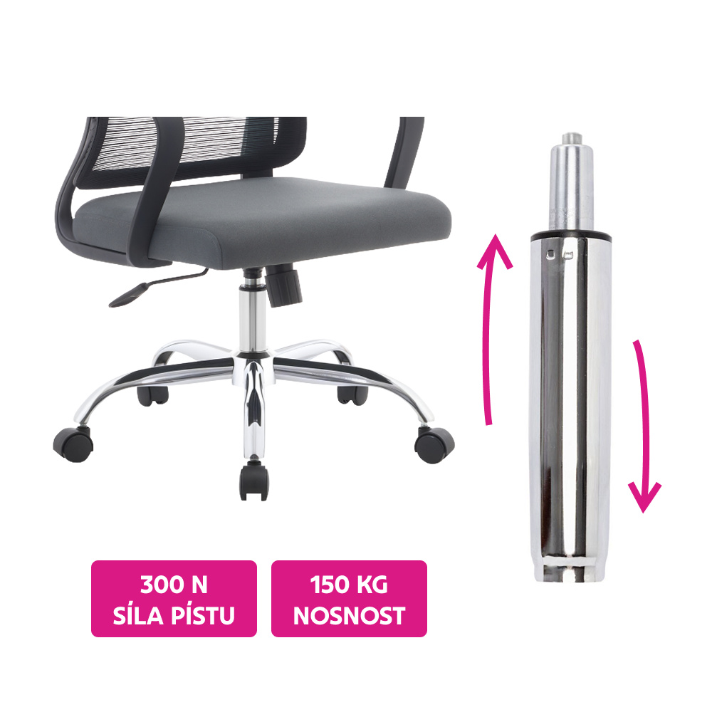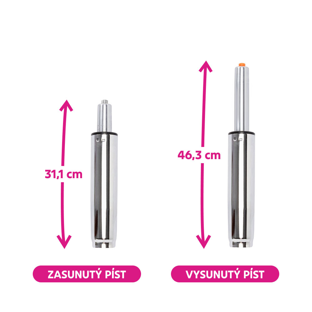 Materiál: kov Barva: chrom Průměr pístu: 5 cm Průměr pístnice: 2,8 cm Celková délka pístu: 46,3 cm Délka těla pístu: 25 cm Prodloužení: 15,2 cm Síla pístu: 300 N Nosnost: max. 150 kg Hmotnost: 0,9 kg Náhradní plynový píst Pro kancelářská křesla Pro kancelářské židle Pro otočné židle