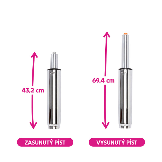 Materiál: kov Barva: chrom Průměr pístu: 5 cm Průměr pístnice: 2,8 cm Celková délka pístu: 69,4 cm Délka těla pístu: 37 cm Prodloužení: 26,2 cm Síla pístu: 300 N Nosnost: Max. 150 kg Hmotnost: 1,2 kg Náhradní plynový píst Pro kancelářská křesla Pro kancelářské židle Pro otočné židle