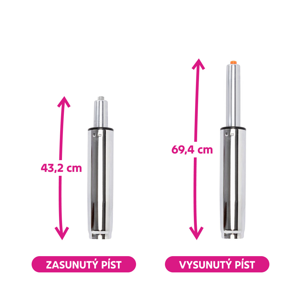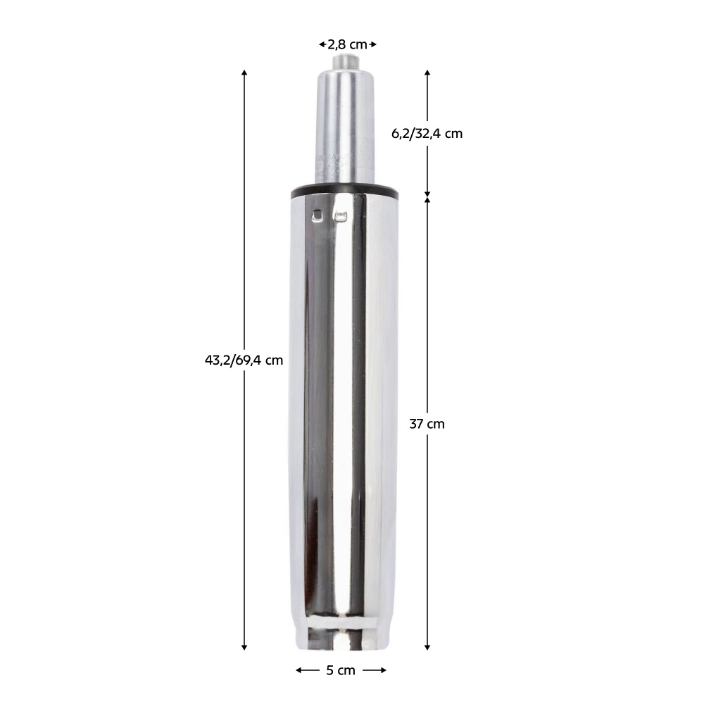 Materiál: kov Barva: chrom Průměr pístu: 5 cm Průměr pístnice: 2,8 cm Celková délka pístu: 69,4 cm Délka těla pístu: 37 cm Prodloužení: 26,2 cm Síla pístu: 300 N Nosnost: Max. 150 kg Hmotnost: 1,2 kg Náhradní plynový píst Pro kancelářská křesla Pro kancelářské židle Pro otočné židle