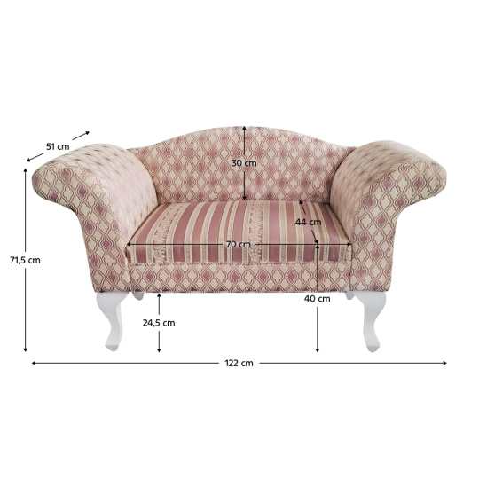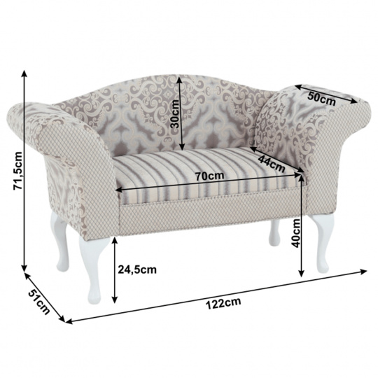 Materiál: látka/dřevo Barva: krémová/šedá/bílá Rozměry (ŠxHxV): 122x51x71,5 cm Výška sedu: 40 cm Šířka sedu: 70 cm Hloubka sedu: 44 cm Výška nožičky: 24,5 cm Výška opěrky na záda: 30 cm Hloubka opěrky na ruce: 50 cm Nosnost: 90 kg Dřevěné nožičky Pěnová výplň Dodáváno v demontu