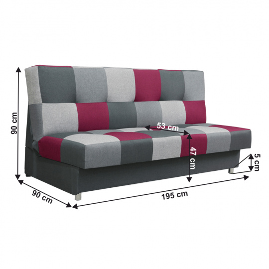 Materiál: látka Malmo Oděruodolnost textilie podle testu Martindale: 30 000 oděrek Barva: bordó/šedá Rozměry (ŠxHxV): 195x90x90 cm Výška spodního prostoru od podlahy: 5 cm rozkládací Rozkládání systémem KLIK KLAK Plocha na spaní: 195x116 cm Nosnost na osobu: 90 kg S úložným prostorem Bonelové výplň sedáku Výška sedu: 47 cm Hloubka sedu: 53 cm na nožičkách Dodávána v demontu Možnost objednat v provedení látka Turkus růžová, tyrkysová, limetková nebo červená v ceně 8.490,- Kč.