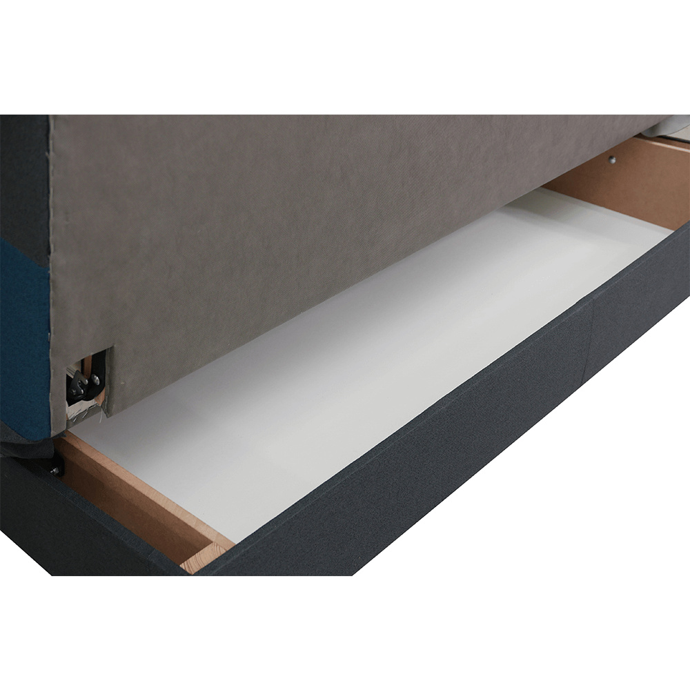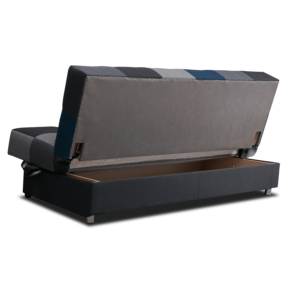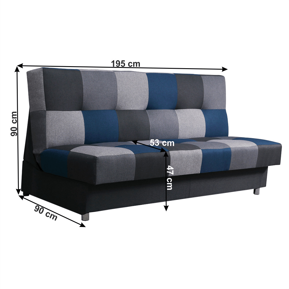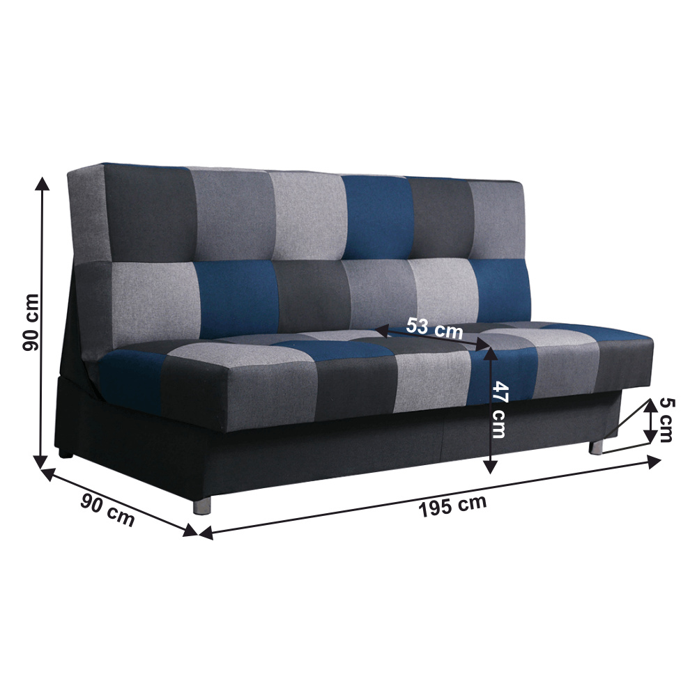 Materiál: látka Malmo Oděruodolnost textilie podle testu Martindale: 30 000 oděrek Barva: modrá/šedá Rozměry (ŠxHxV): 195x90x90 cm Výška spodního prostoru od podlahy: 5 cm rozkládací Rozkládání systémem KLIK KLAK Plocha na spaní: 195x116 cm Nosnost na osobu: 90 kg S úložným prostorem Bonelové výplň sedáku Výška sedu: 47 cm Hloubka sedu: 53 cm na nožičkách Možnost objednat v provedení látka Turkus růžová, tyrkysová, limetková nebo červená v ceně 8.490,- Kč.