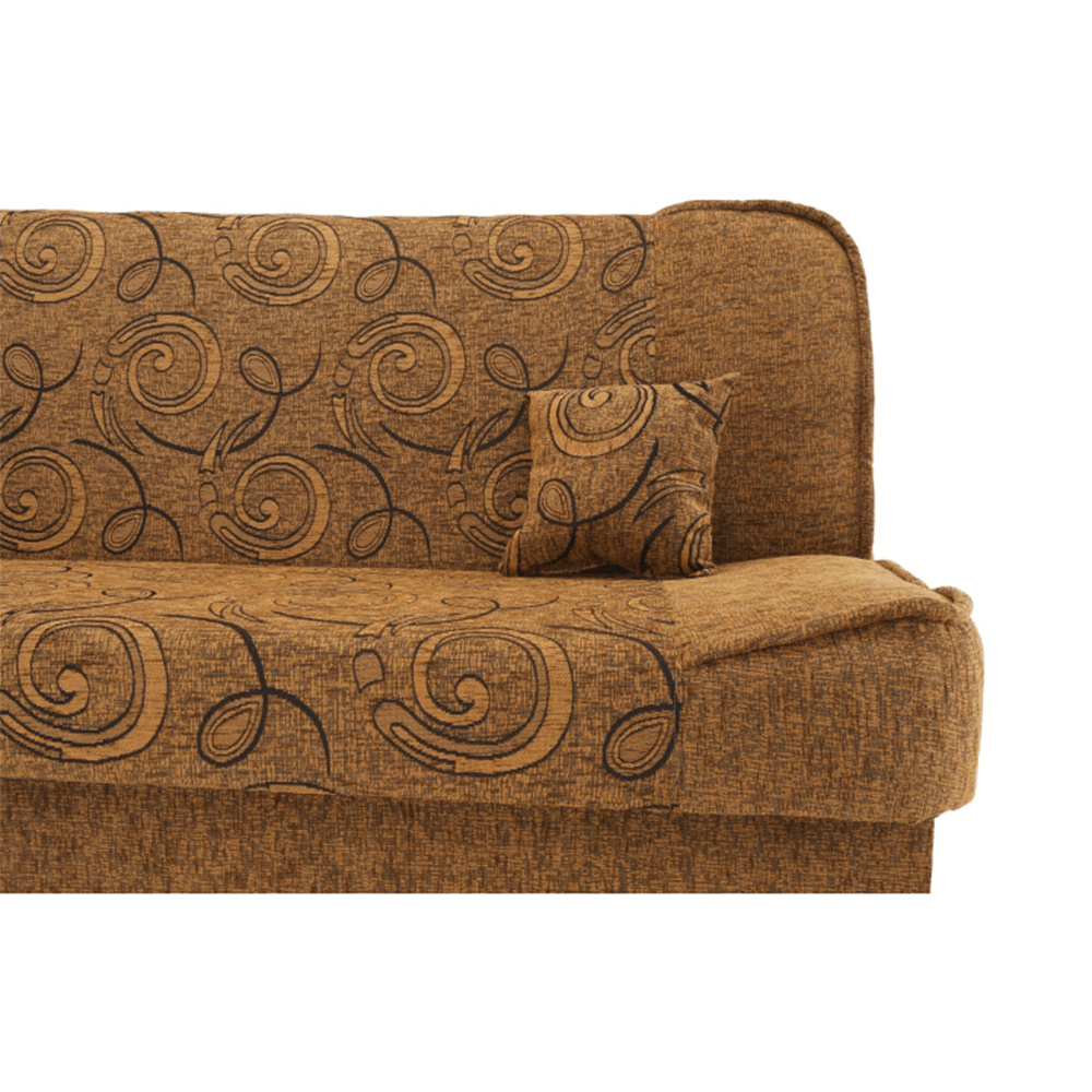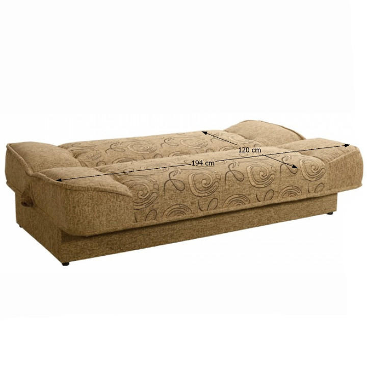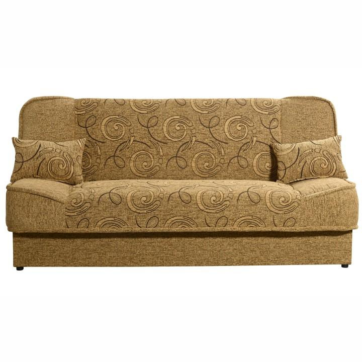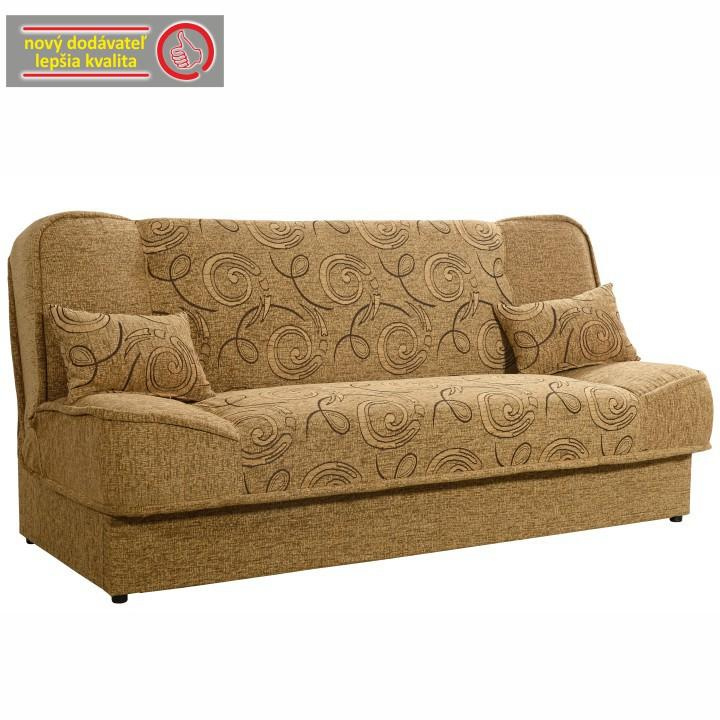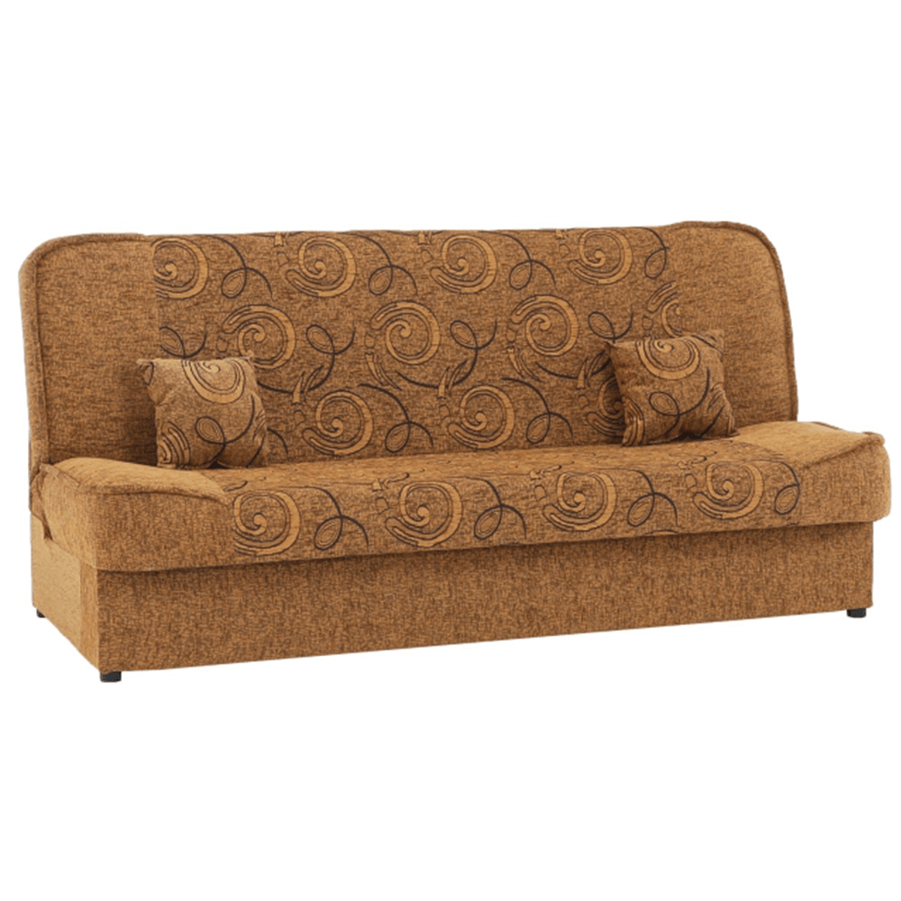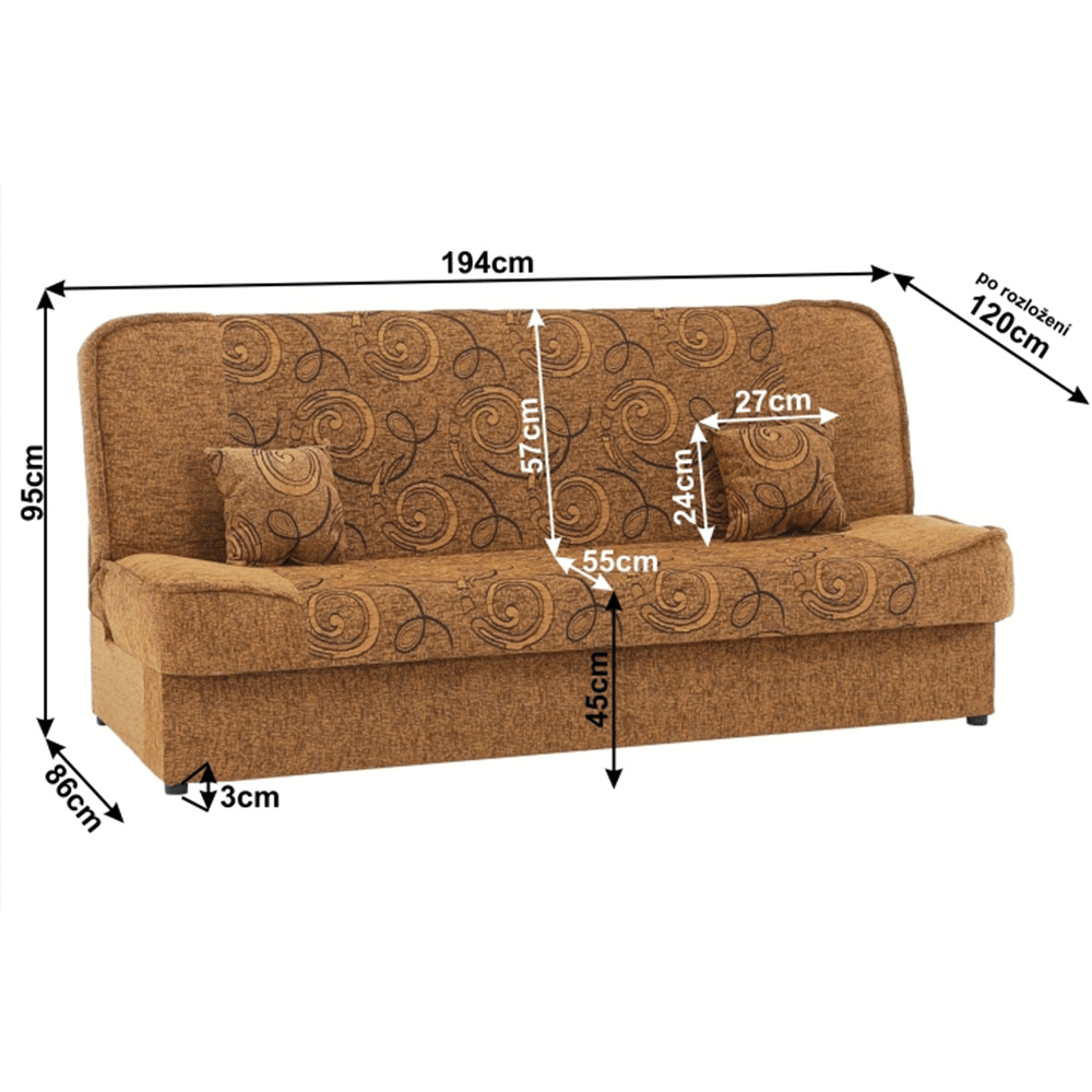 Rozkládací pohovka ASIA NEW Materiál: látka šenil Oděruodolnost textilie podle testu Martindale: 65 000 oděrek Barva: zlatá / vzor Rozměry ŠxHxV: 194x86x95 cm, plocha na spaní: ŠxD: 120x194 cm Nosnost na osobu: 90 kg Dva dekorativní polštáře Úložný prostor. Dodávané v demontu.