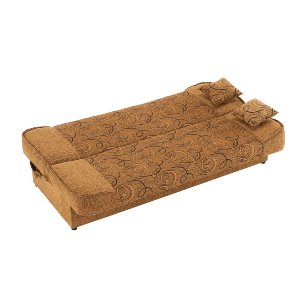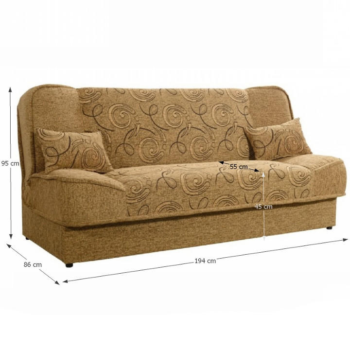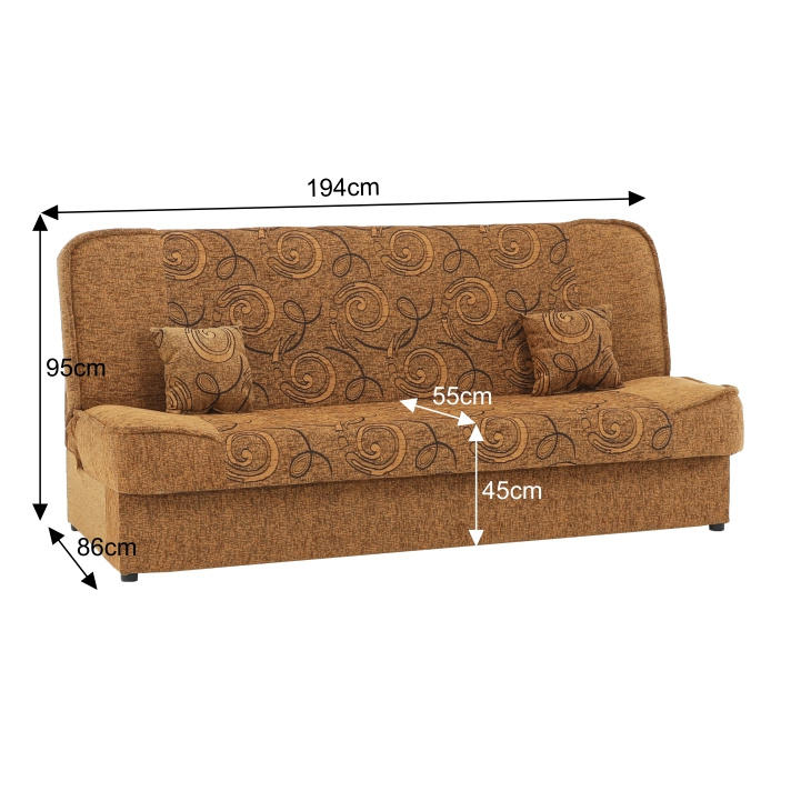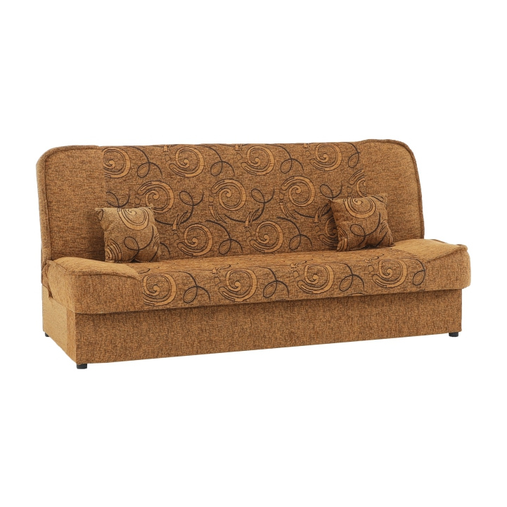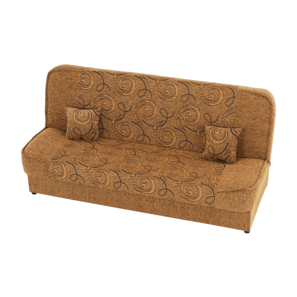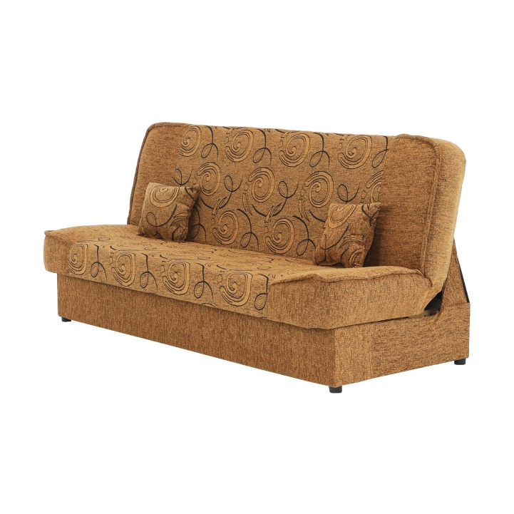 Rozkládací pohovka ASIA NEW Materiál: látka šenil Oděruodolnost textilie podle testu Martindale: 65 000 oděrek Barva: zlatá / vzor Rozměry ŠxHxV: 194x86x95 cm, plocha na spaní: ŠxD: 120x194 cm Nosnost na osobu: 90 kg Dva dekorativní polštáře Úložný prostor. Dodávané v demontu.