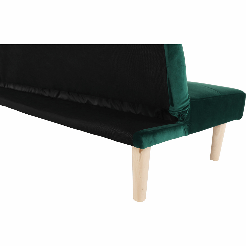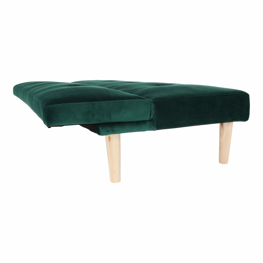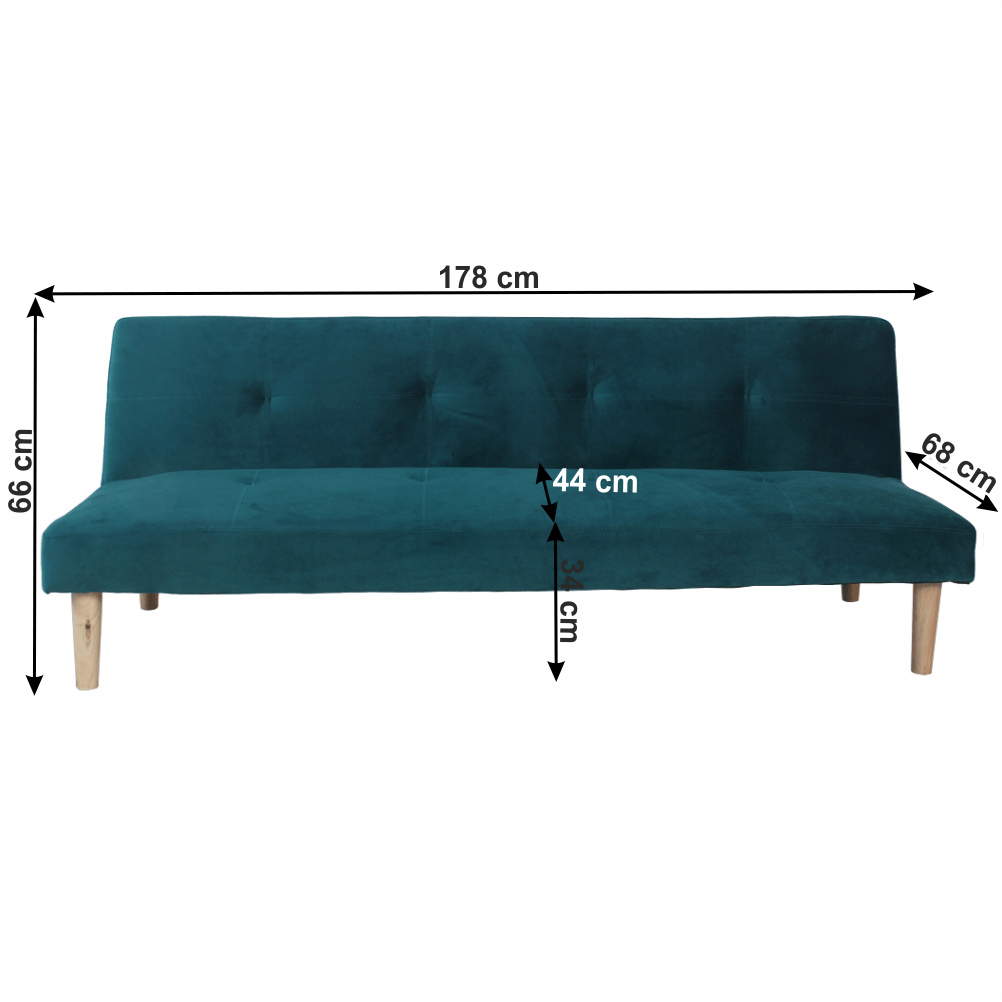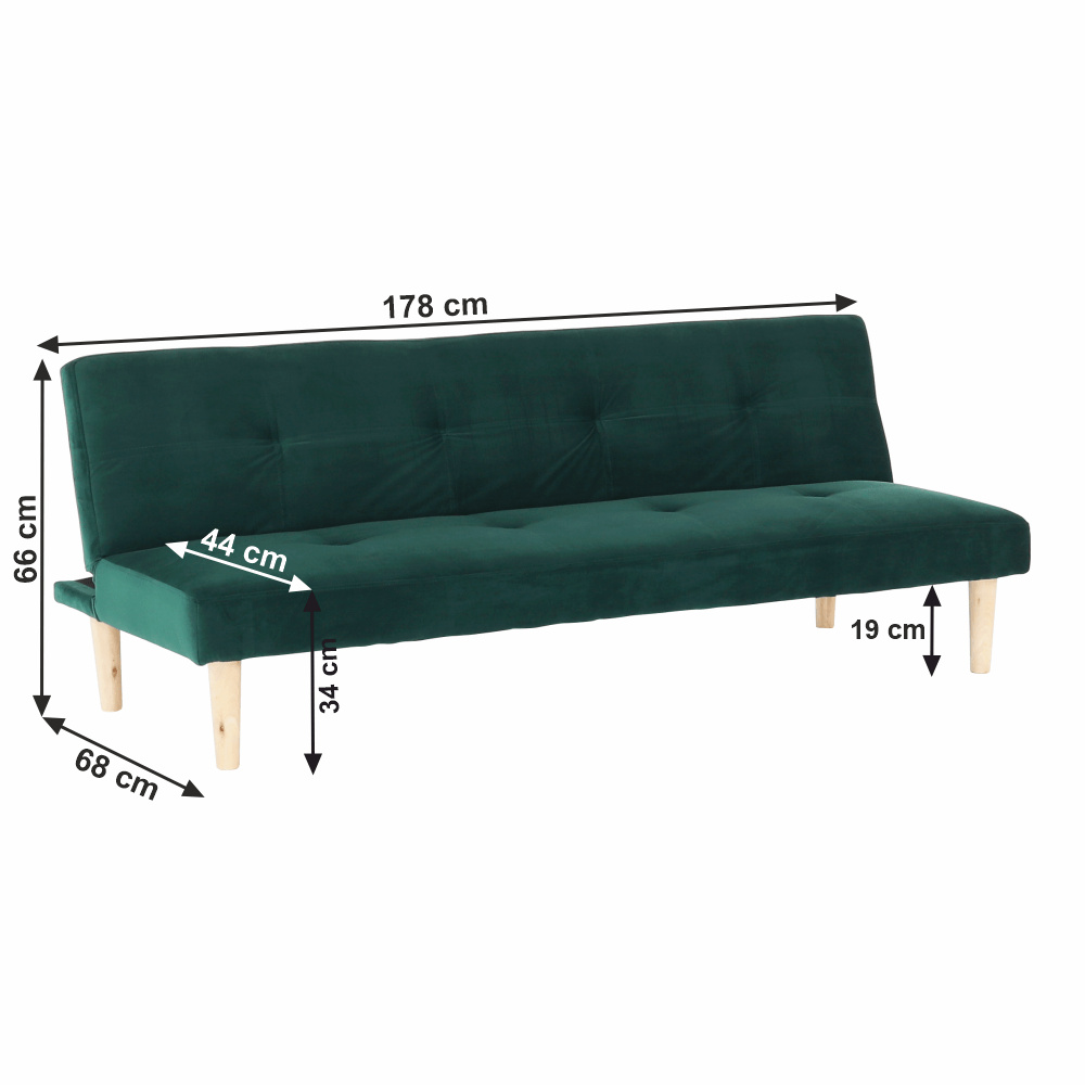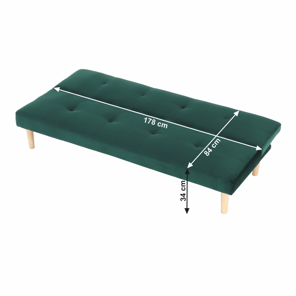 Materiál čalounění: Velvet látka Oděruodolnost textilie podle testu Martindale: 80 000 oděrek Barva čalounění: smaragdová Materiál nohy: dřevo Barva nohy: dub Rozměry (ŠxHxV): 178x68x66 cm rozkládací Plocha na spaní (ŠxHxV): 178x84x34 cm Výška sedu: 34 cm Hloubka sedu: 44 cm Nosnost: 90 kg moderní design Molitanová výplň sedáku Dřevěné nožičky Dodávané v demontu
