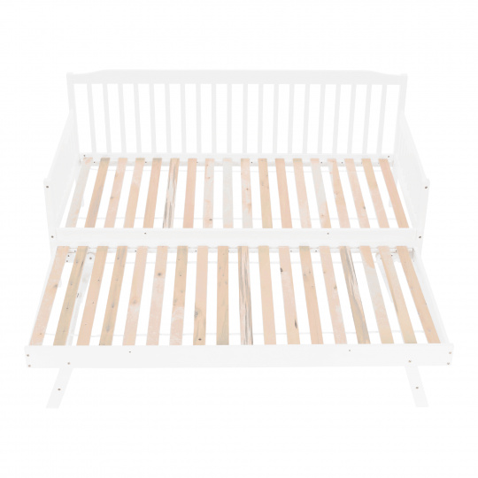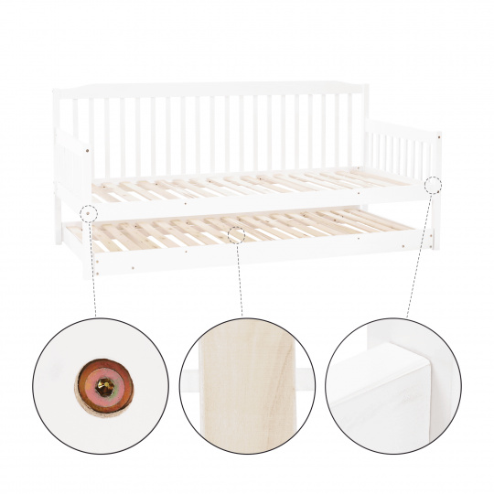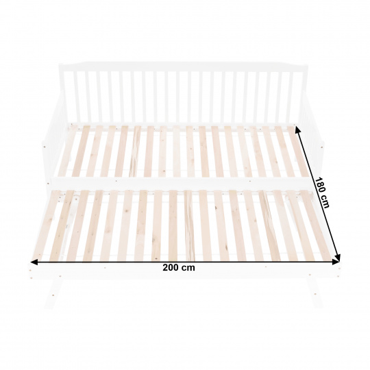 Materiál: borovicový masiv / překližka (rošt) Barva: bílá Rozměry (ŠxHxV): 212x96x94cm Plocha na spaní (ŠxH): 90x200 cm Plocha na spaní po přiložení přistýlky (ŠxH): 180x200 cm Matrace s max. výškou na Přistýlka: 16 cm Přistýlka na kolečkách a skládacích nohách Výška po rošt horní lůžko: 37 cm Nosnost: 90kg Dodávané bez matrace Dodávané s rolováním rošty Možnost zakoupit matrace z naší nabídky Dodávané v demontu