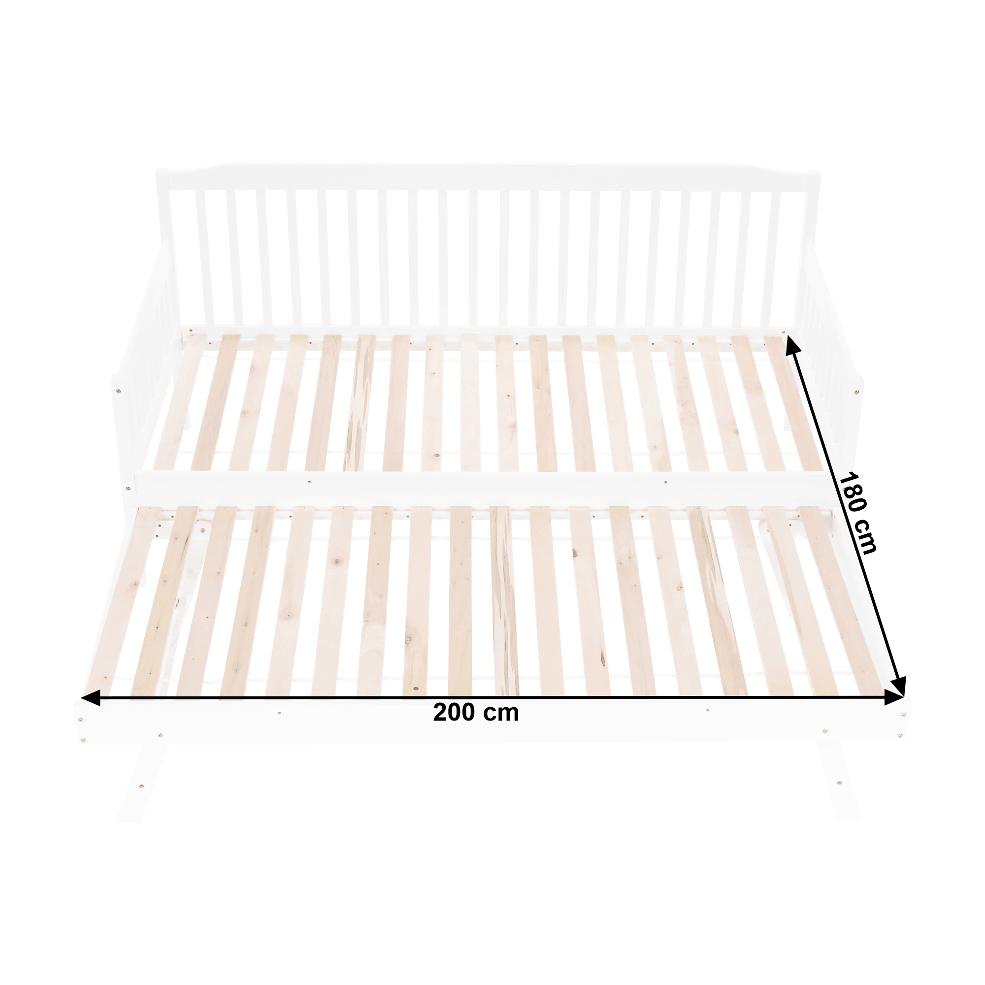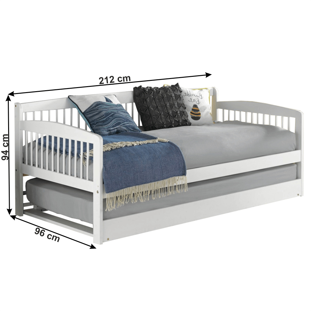 Materiál: borovicový masiv / překližka (rošt) Barva: bílá Rozměry (ŠxHxV): 212x96x94cm Plocha na spaní (ŠxH): 90x200 cm Plocha na spaní po přiložení přistýlky (ŠxH): 180x200 cm Matrace s max. výškou na Přistýlka: 16 cm Přistýlka na kolečkách a skládacích nohách Výška po rošt horní lůžko: 37 cm Nosnost: 90kg Dodávané bez matrace Dodávané s rolováním rošty Možnost zakoupit matrace z naší nabídky Dodávané v demontu