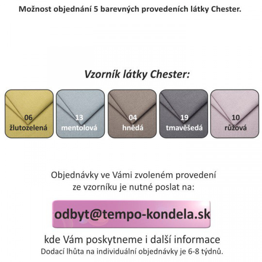 ;"Stylová pohovka BROKEN Materiál: látka Chester / dřevo Oděruodolnost textilie podle testu Martindale: 100 000 oděrek Barva: Chester 17 šedá / buk Rozměry (ŠxHxV): 144x76x67 cm Nosnost na osobu: 90 kg Výška spodního prostoru od podlahy: 13 cm Výška sedu: 41 cm Hloubka sedu: 53 cm Levé provedení. Molitanová výplň. Dodávané v demontu. Možnost objednání v 5 barevných provedeních látky Chester v ceně: 6.790,-Kč. Při individuální objednávce je třeba zaplatit 20% zálohu z dané částky. Po uhrazení zálohy bude Vaša objednávka zadána do výroby. Dodací lhůta 6-8 týdnů.
