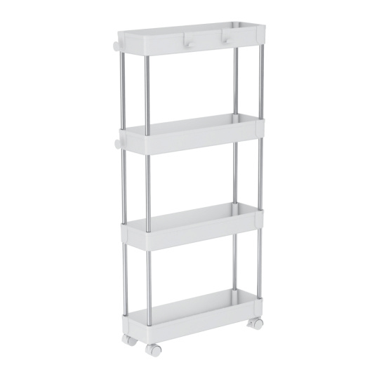 Materiál: plast/nerezová ocel Barva: bílá Rozměry (ŠxHxV): 40x13x85 cm Čtyři plastové police Výška police: 5 cm Výška mezi policemi: 25,5 cm Nosnost polce: 3 kg Zabezpečená cirkulace vzduchu S háčky Pojízdný Na kolečkách Otočné Výška koleček: 4,2 cm Čtyři kolečka Dvě kolečka s brzdami Nerezová ocelová konstrukce Moderní design Dodáváno v demontu