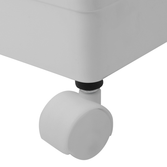 Materiál: plast/nerezová ocel Barva: bílá Rozměry (ŠxHxV): 40x22x60 cm Tři plastové police Výška police: 5 cm Výška mezi policemi: 25,5 cm Nosnost police: 3 kg Zabezpečená cirkulace vzduchu S háčky Pojízdný Na kolečkách Otočné Výška koleček: 4,2 cm Čtyři kolečka Dvě kolečka s brzdami Nerezová ocelová konstrukce Moderní design Dodáváno v demontu