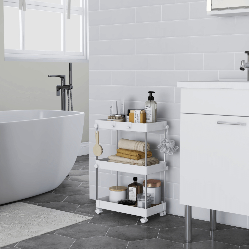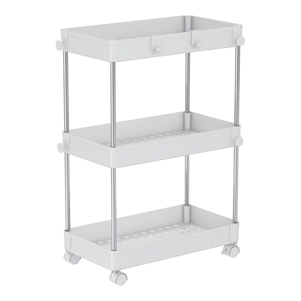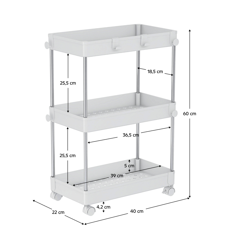 Materiál: plast/nerezová ocel Barva: bílá Rozměry (ŠxHxV): 40x22x60 cm Tři plastové police Výška police: 5 cm Výška mezi policemi: 25,5 cm Nosnost police: 3 kg Zabezpečená cirkulace vzduchu S háčky Pojízdný Na kolečkách Otočné Výška koleček: 4,2 cm Čtyři kolečka Dvě kolečka s brzdami Nerezová ocelová konstrukce Moderní design Dodáváno v demontu