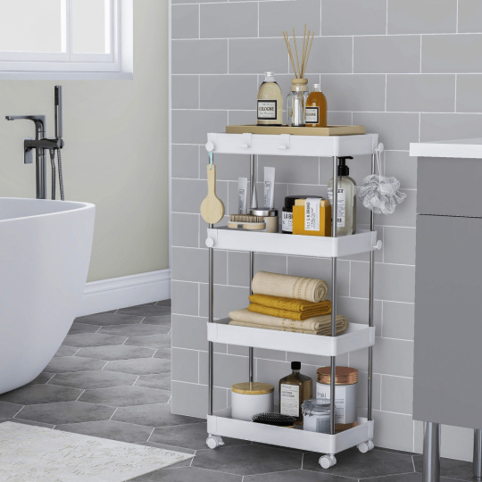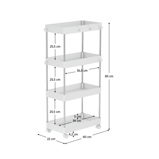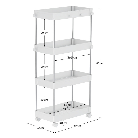 Materiál: plast/nerezová ocel Barva: bílá Rozměry (ŠxHxV): 40x22x85 cm Čtyři plastové police Výška police: 4,8 cm Výška mezi policemi: 20 cm Nosnost police: 3 kg Zabezpečená cirkulace vzduchu S háčky Pojízdný Na kolečkách Otočné Výška koleček: 3,8 cm Čtyři kolečka Dvě kolečka s brzdami Nerezová ocelová konstrukce Moderní design Dodáváno v demontu