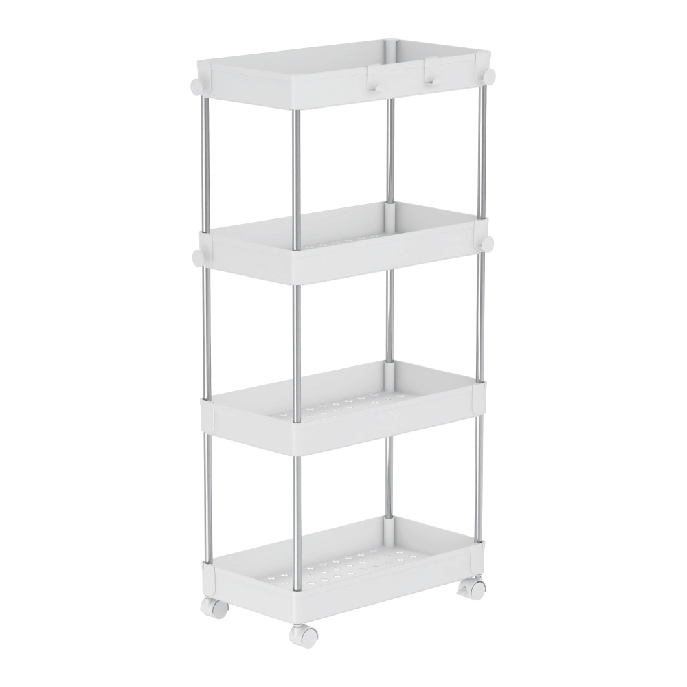 Materiál: plast/nerezová ocel Barva: bílá Rozměry (ŠxHxV): 40x22x85 cm Čtyři plastové police Výška police: 4,8 cm Výška mezi policemi: 20 cm Nosnost police: 3 kg Zabezpečená cirkulace vzduchu S háčky Pojízdný Na kolečkách Otočné Výška koleček: 3,8 cm Čtyři kolečka Dvě kolečka s brzdami Nerezová ocelová konstrukce Moderní design Dodáváno v demontu