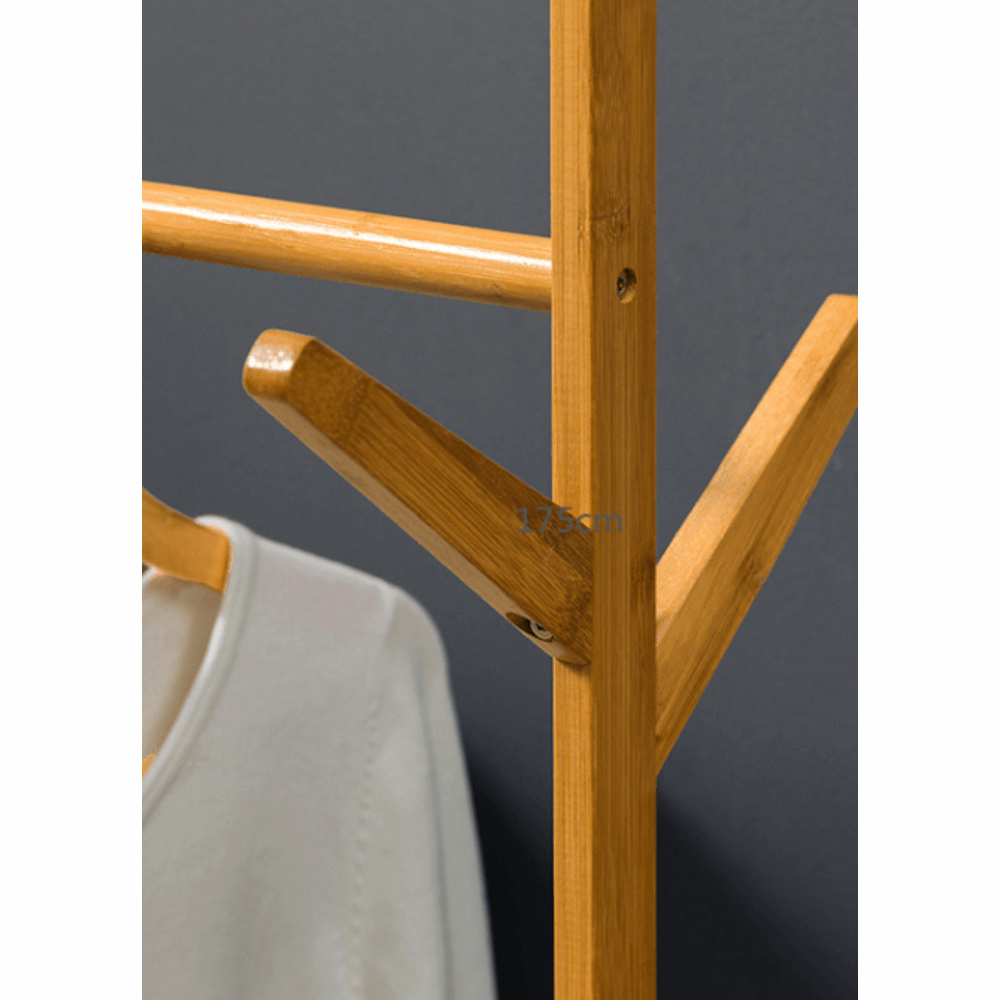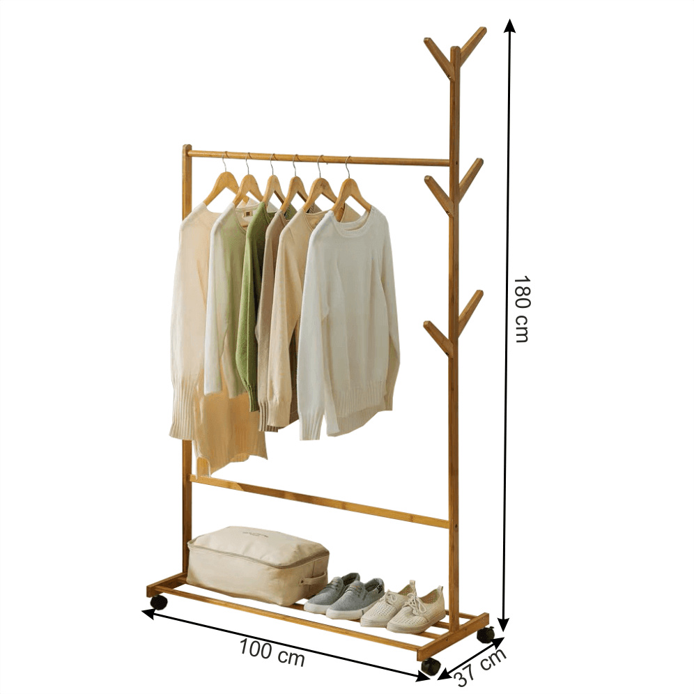 Materiál: bambus Barva: bambus Rozměry (ŠxHxV): 100x35x174 cm Nosnost: 15 kg věšáková tyč Spodní police šest háčků čtyři kolečka Dodávané v demontu