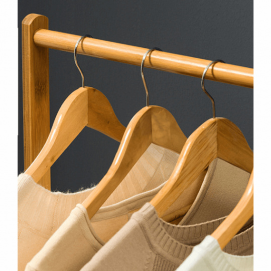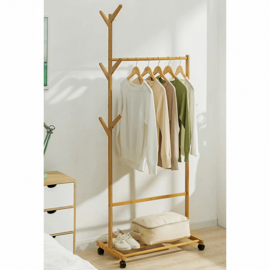 Materiál: bambus Farba: bambus Rozmery (ŠxHxV): 80x35x174 cm Nosnost: 15 kg Vešiaková tyč Spodná polica Šesť háčikov Štyri kolieska Dodávané v demonte