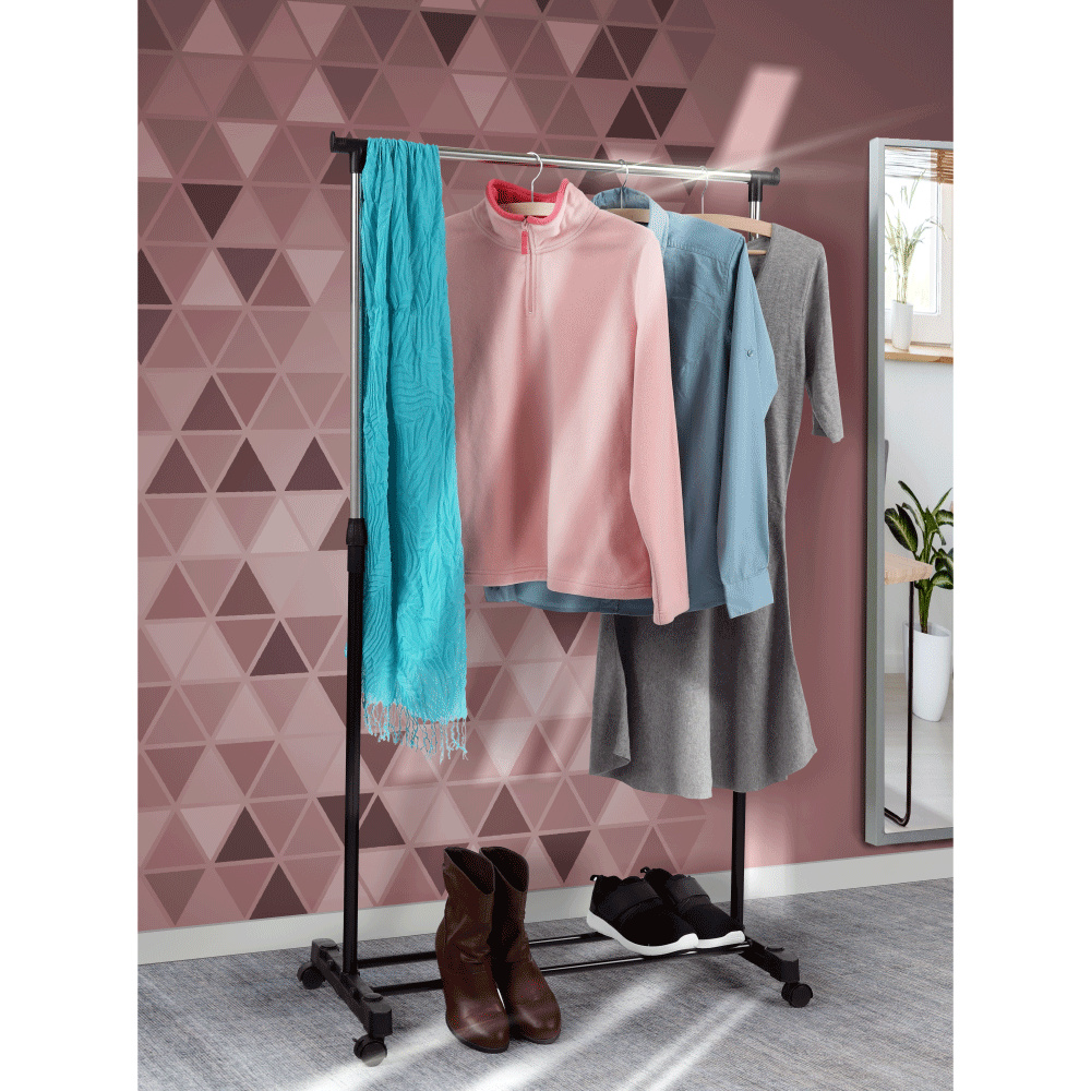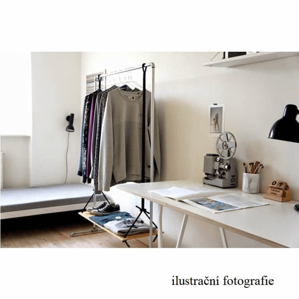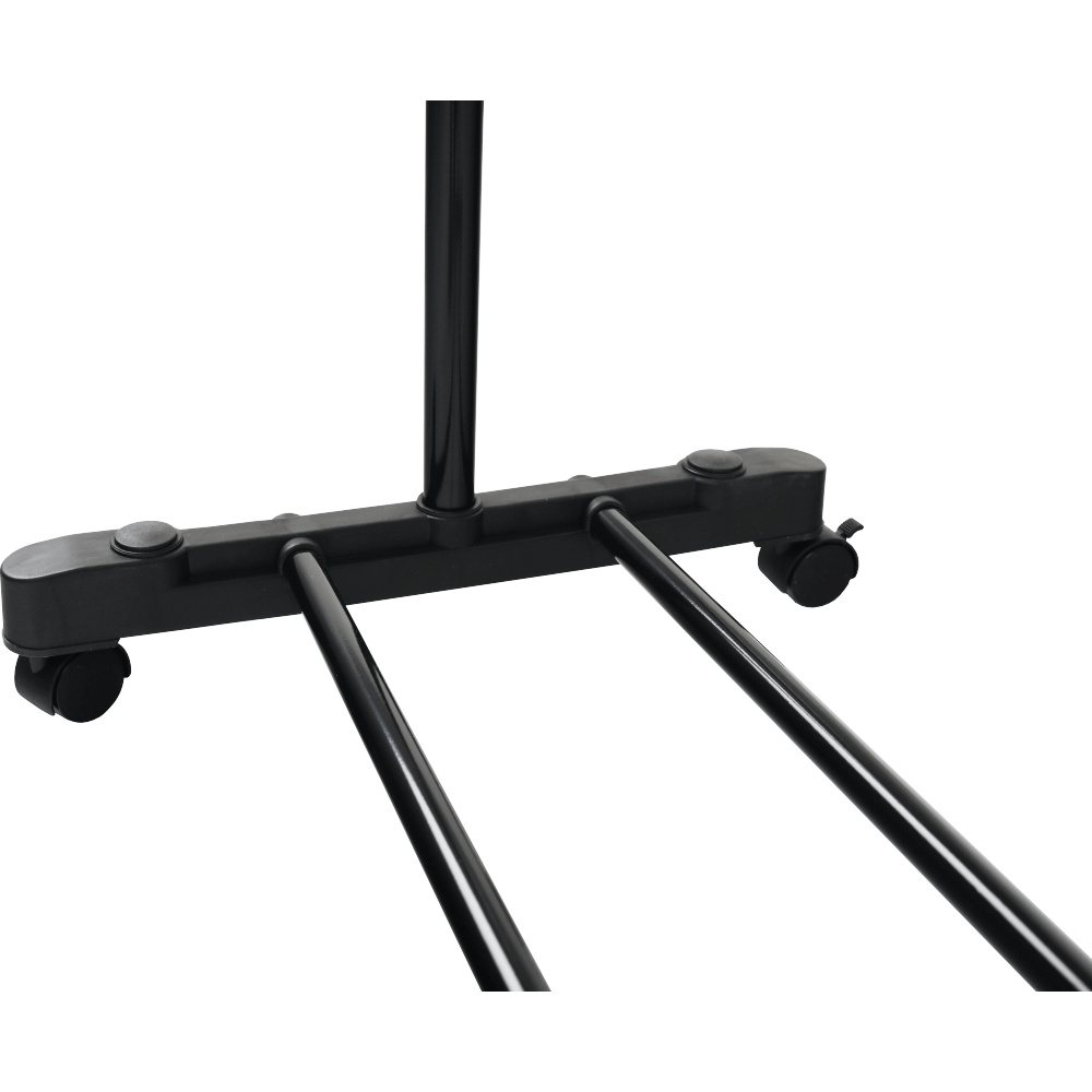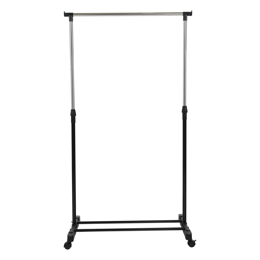 pojazdný věšák s kolečky a jednou závěsnou výškově nastavitelnou tyčí, provedení: nerezový kov + černý plast, rozměry ŠxHxV: 75,5x43x92-159 cm
