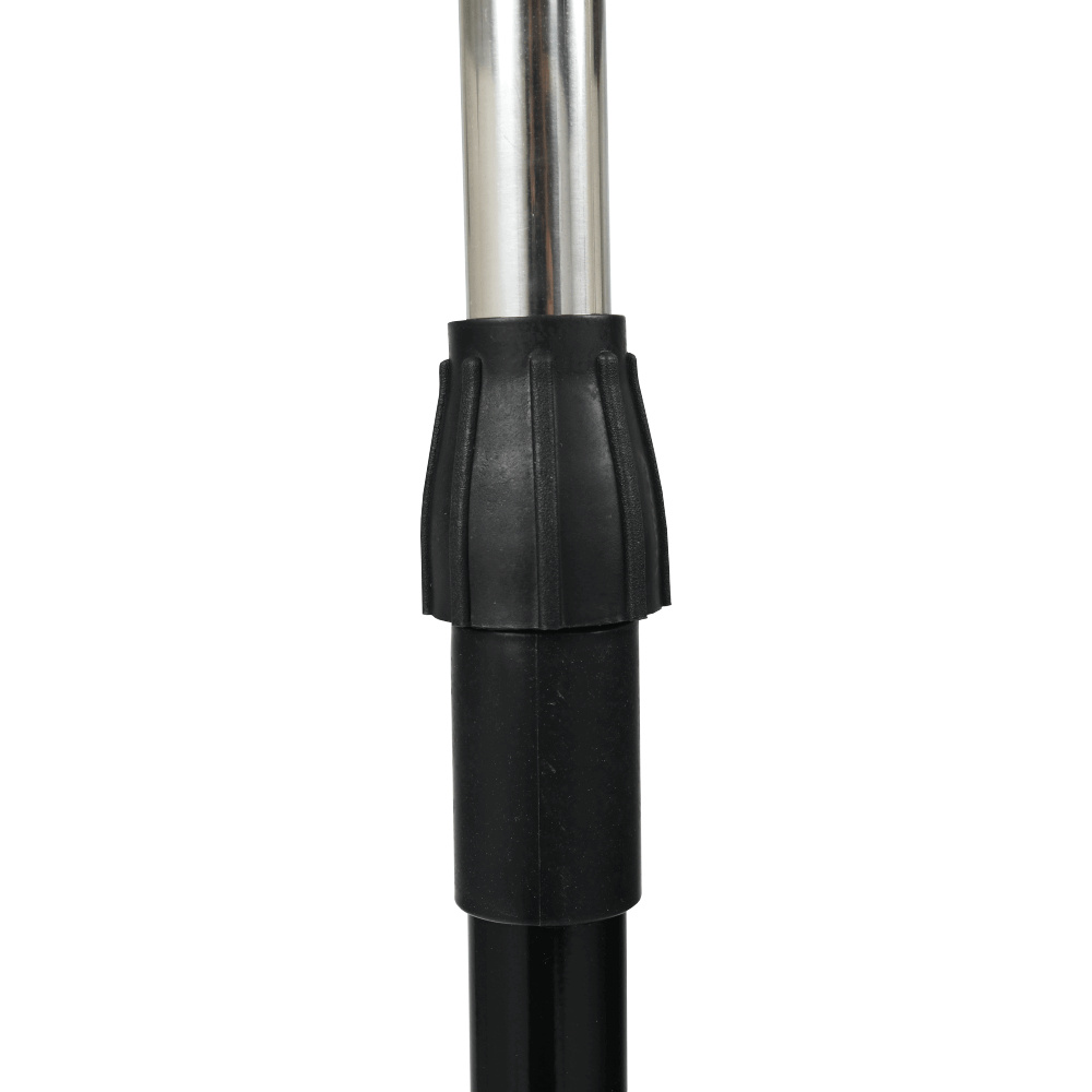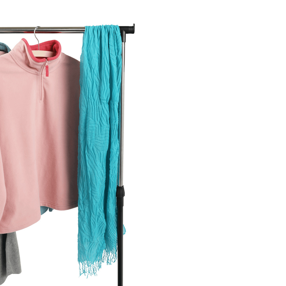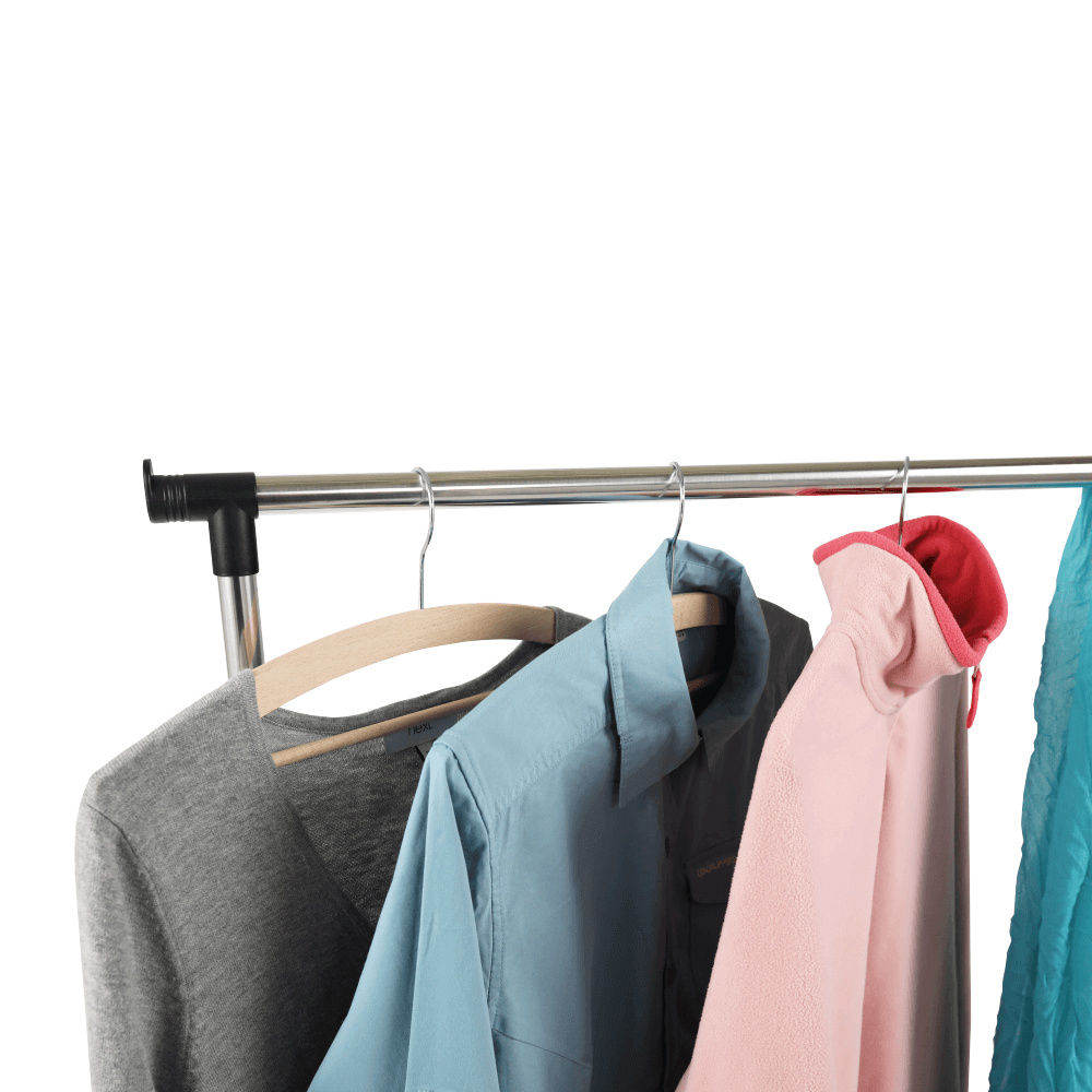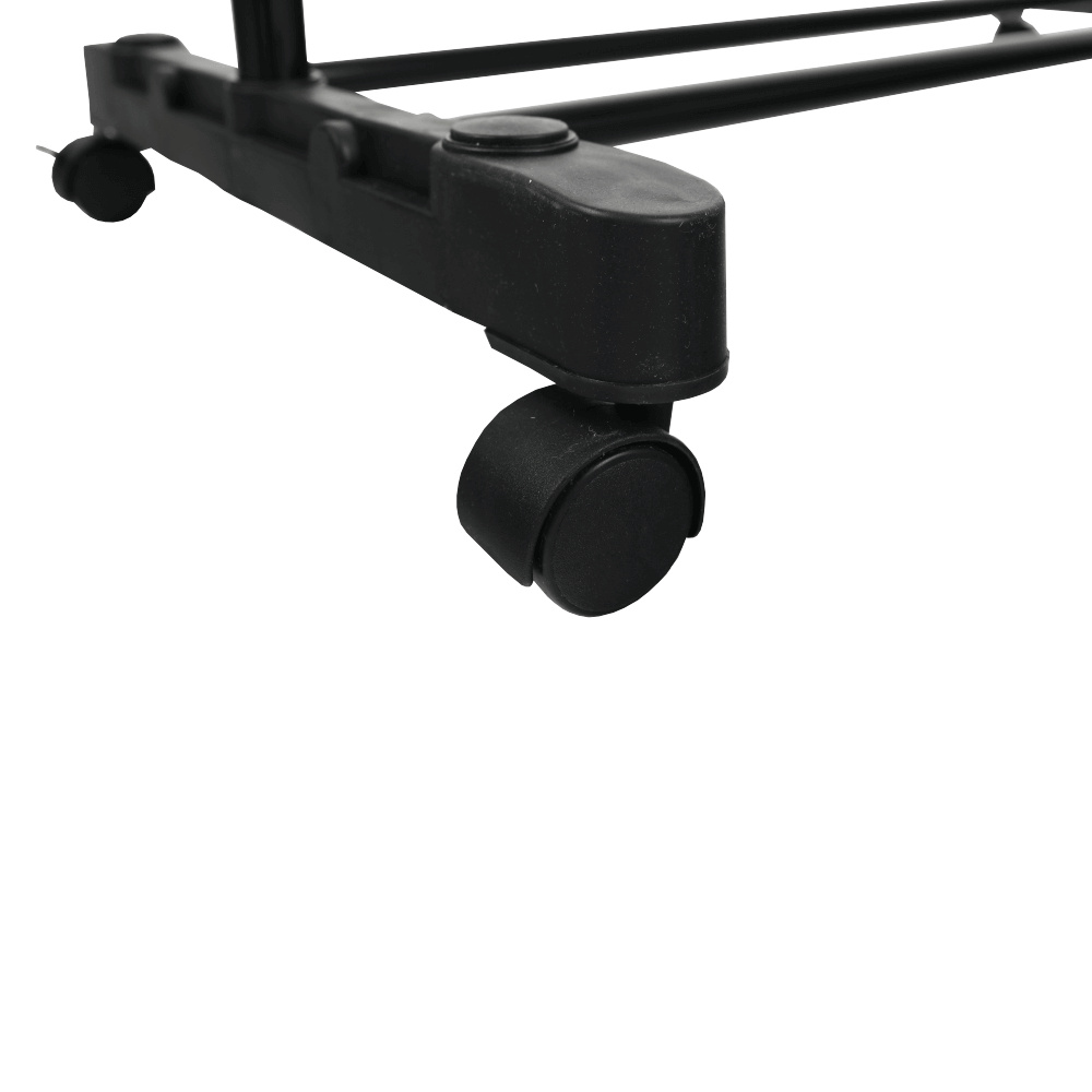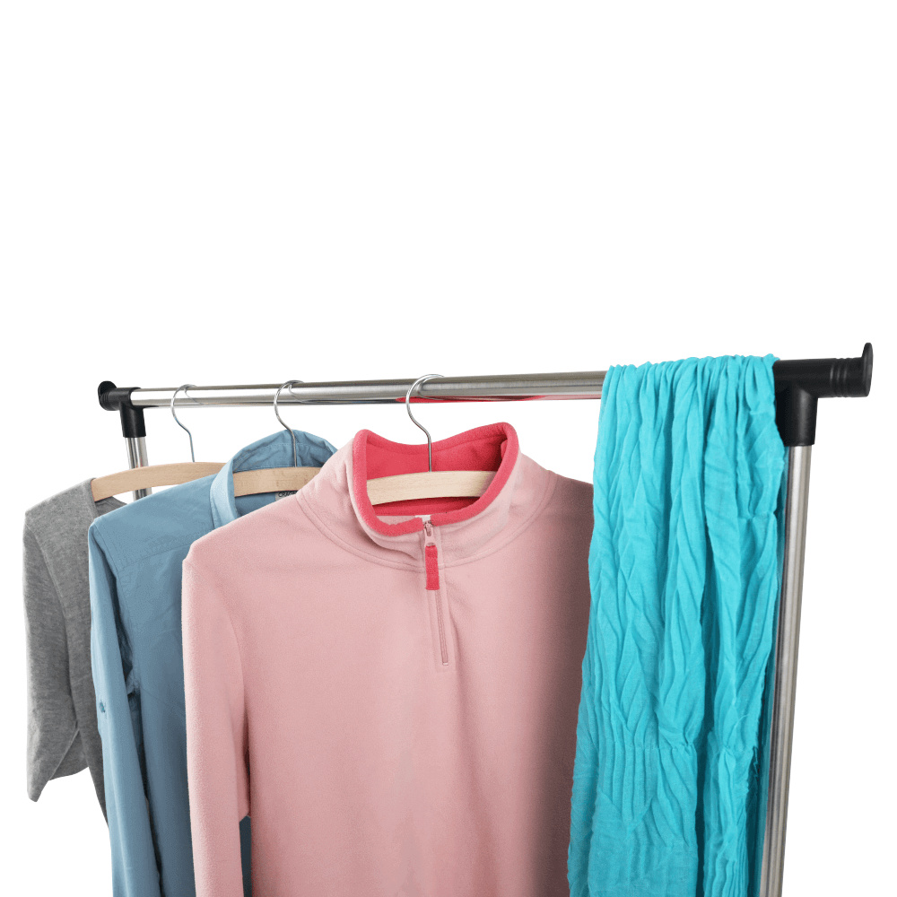 pojazdný věšák s kolečky a jednou závěsnou výškově nastavitelnou tyčí, provedení: nerezový kov + černý plast, rozměry ŠxHxV: 75,5x43x92-159 cm